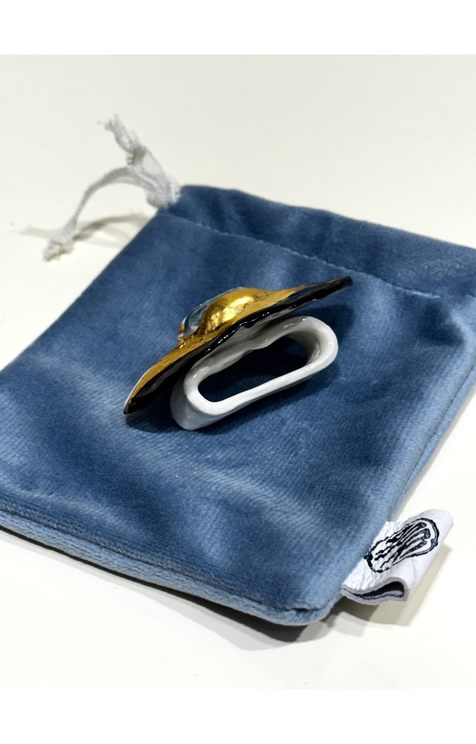 Die Brosche Auge von A.PRI Jewelry ist ein mystisches und kunstvolles Accessoire, das durch seine Ausdruckskraft sofort ins Auge sticht. Das Stück ist in Form eines stilisierten Auges gestaltet, das auf antike Amulette und Symbolik verweist. Die Basis besteht aus glatter weißer Emaille, die als Leinwand für die leuchtenden Details dient. Eine goldene Textur imitiert Strahlen oder Falten um den Augapfel, wodurch ein handgeprägter Effekt entsteht, während schwarze Emaille den oberen Teil umrahmt. Im Zentrum befindet sich ein ausdrucksstarker Augapfel mit einer zartblauen Iris, die dem Blick Tiefe und Geheimnis verleiht.