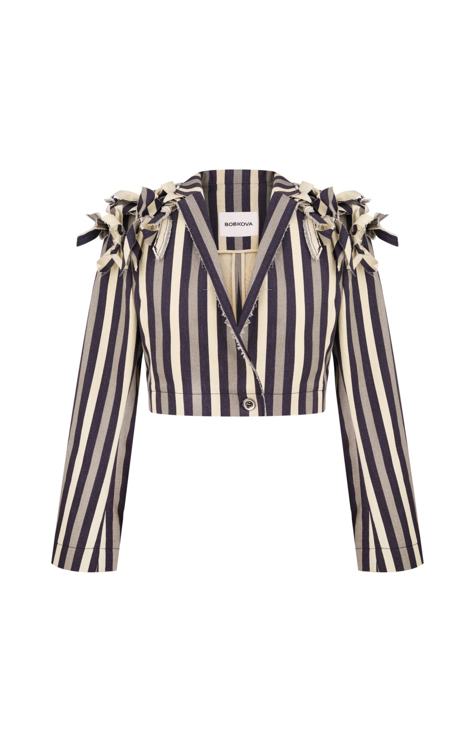 Diese Kurzjacke von Bobkova ist ein Statement-Piece, das klassische Muster mit avantgardistischer Struktur verbindet.