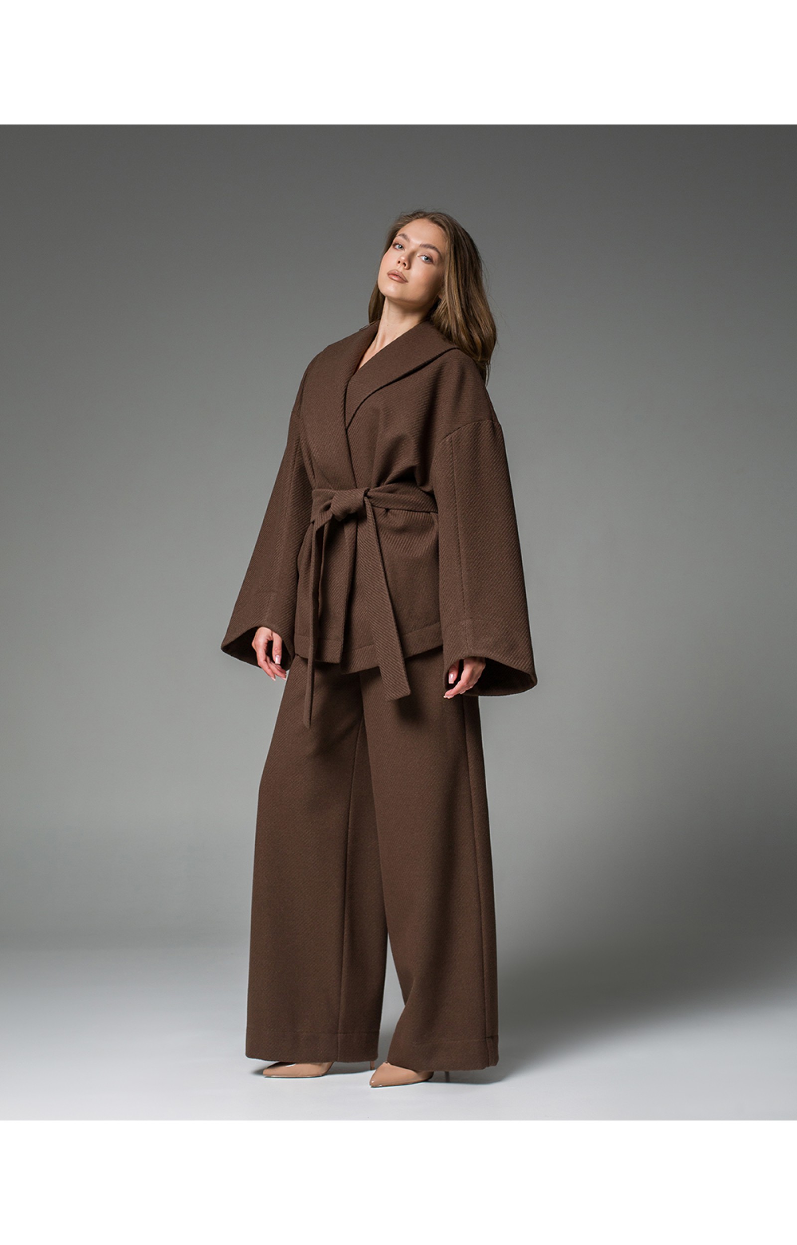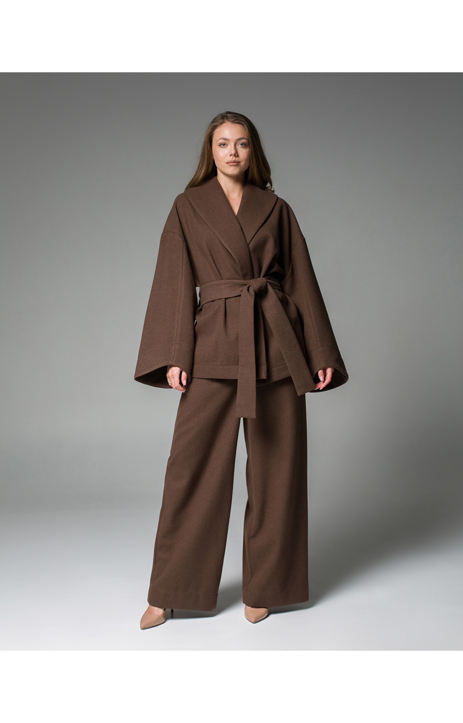 Das Zusammenspiel aus einer lockeren Kimono-Silhouette und einer perfekt sitzenden High-Waist-Hose macht dieses Set zu einem vielseitigen Key-Piece.