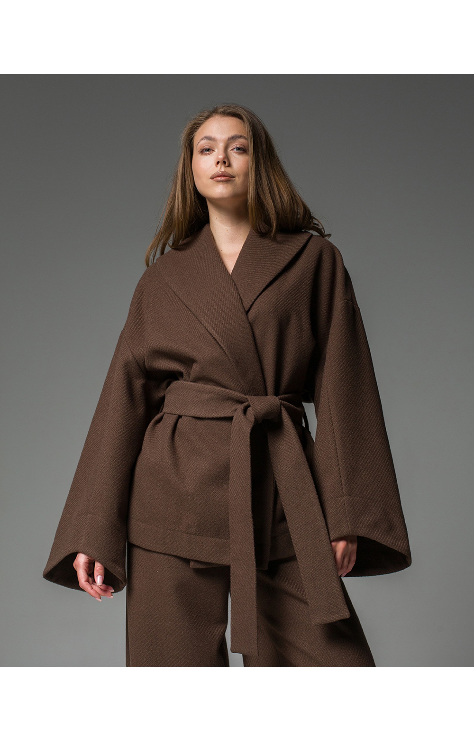 • Kimono-Jacke: Oversize-Passform mit breitem Schalkragen und charakteristischen Ärmeln mit geschwungenem Saum. Ungefüttert und mit einem Bindegürtel für eine individuelle Taillierung.