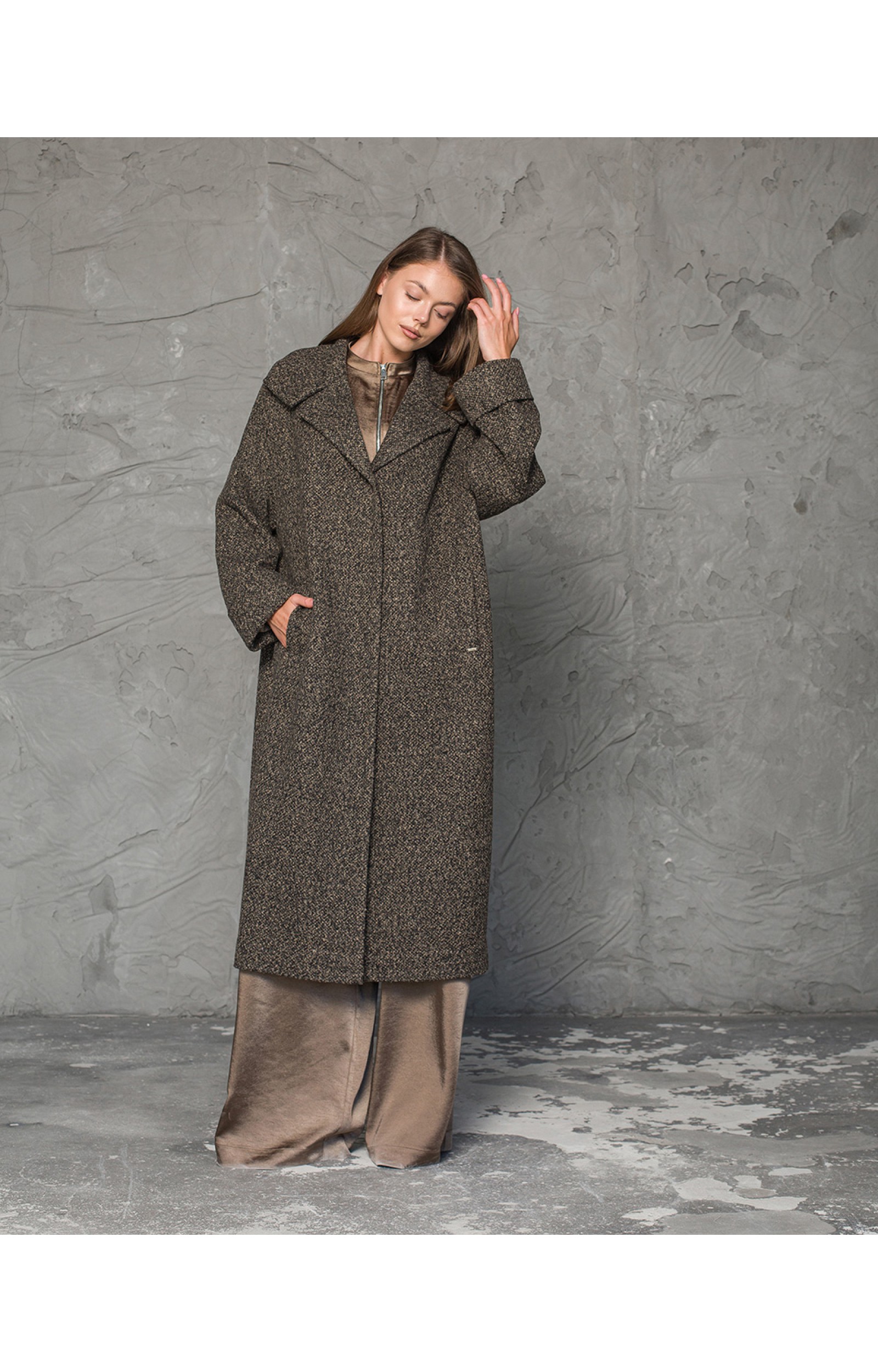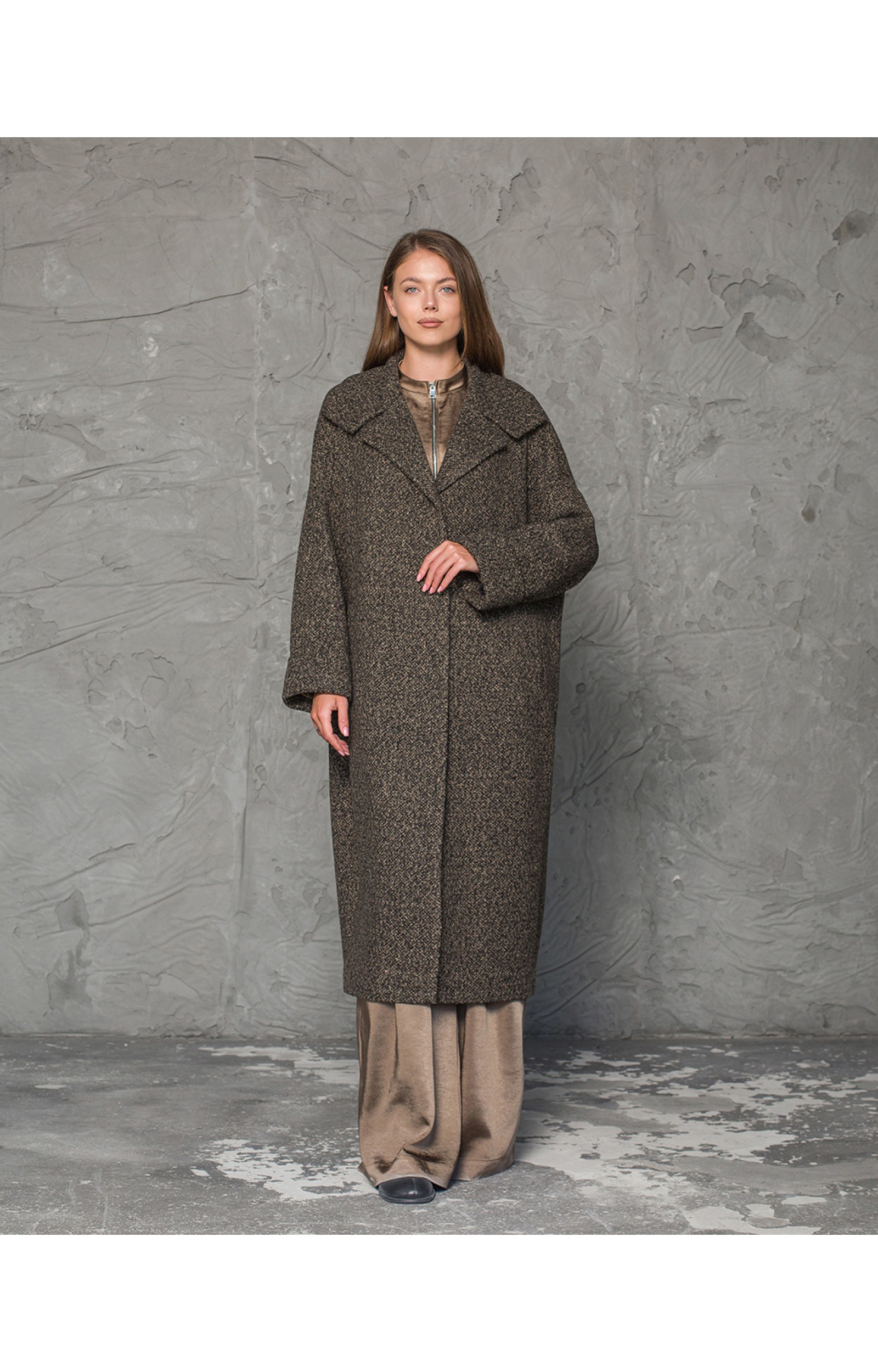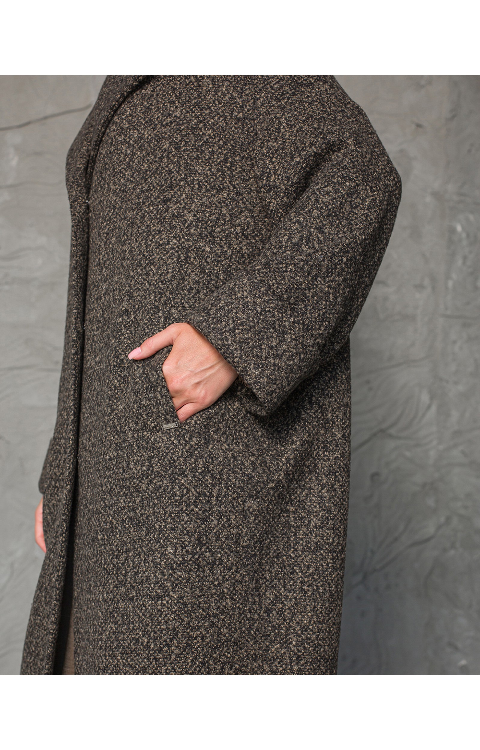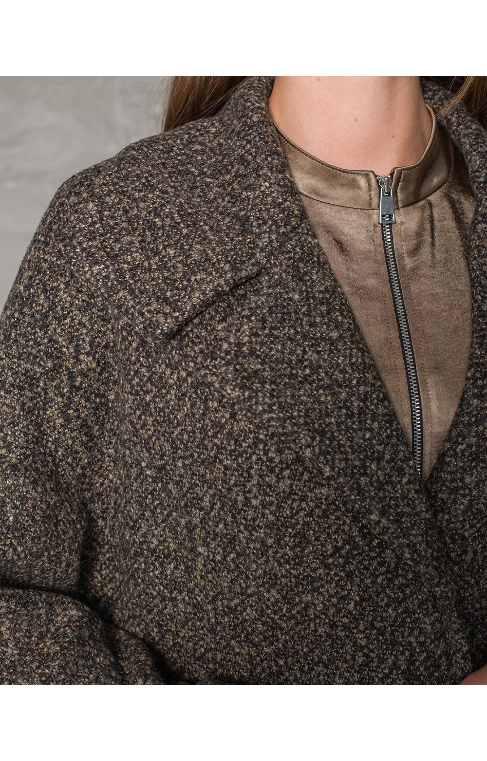 Die lockere Kokon-Silhouette und die überschnittenen Schultern sorgen für einen zeitgemäßen Oversize-Look, während das melierte Gewebe dem Modell eine exklusive Struktur verleiht.