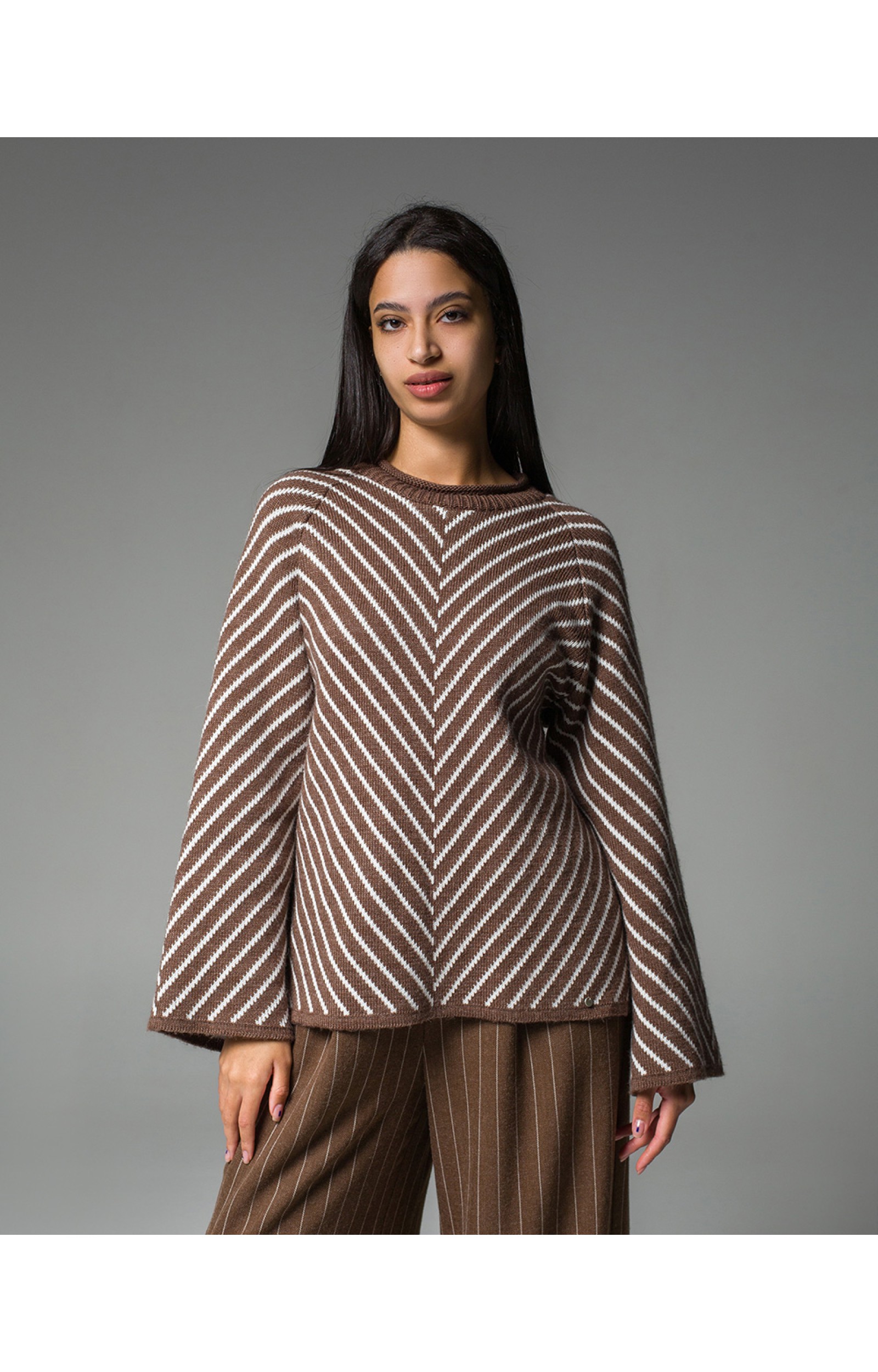 Die kontrastierenden Diagonalstreifen im Ton Milchkaffee erzeugen einen markanten grafischen Rhythmus, der der Silhouette eine moderne Note verleiht.
