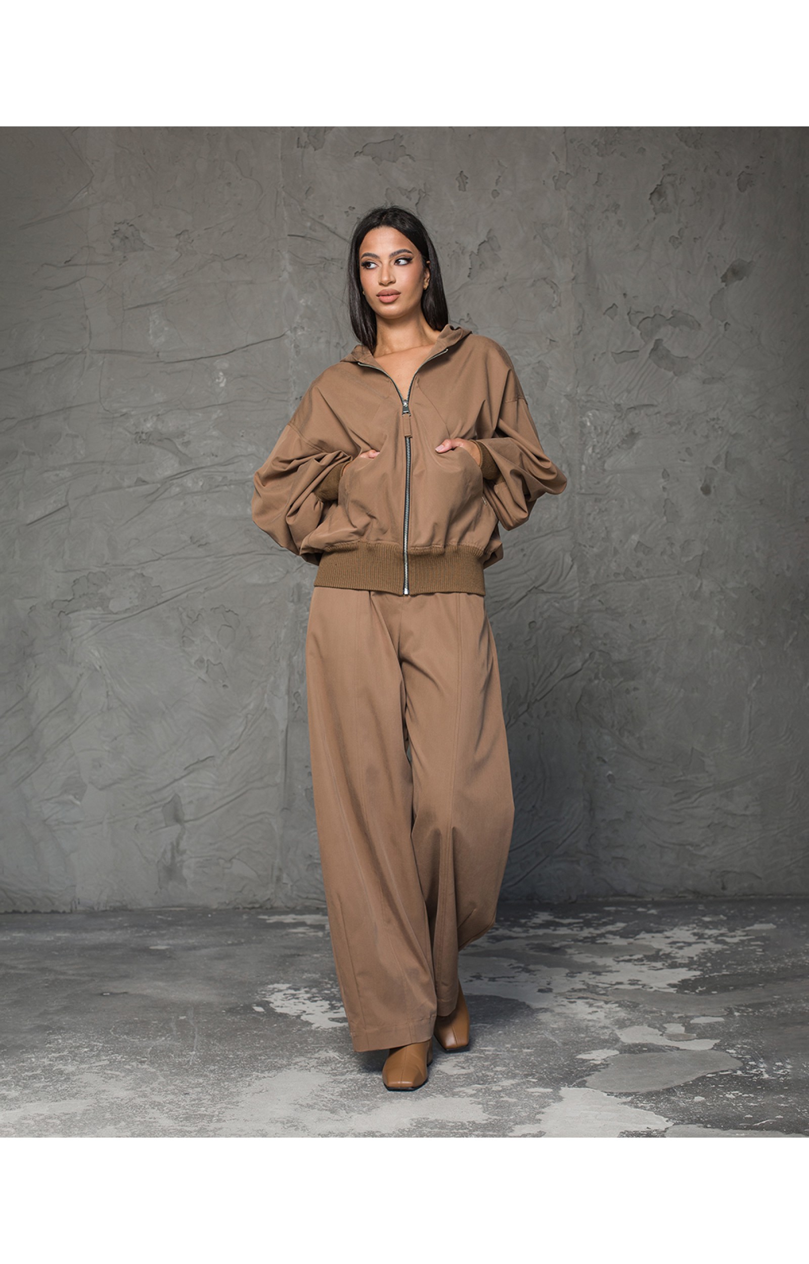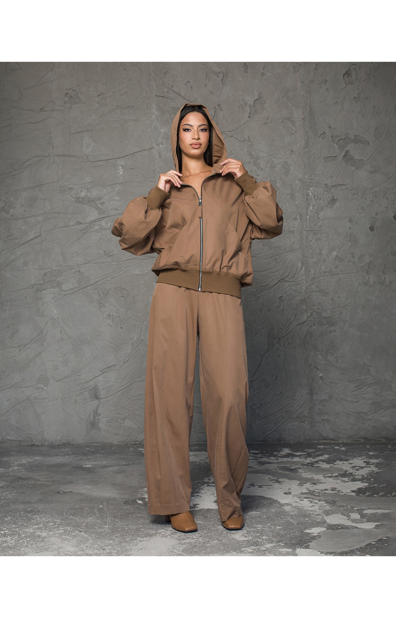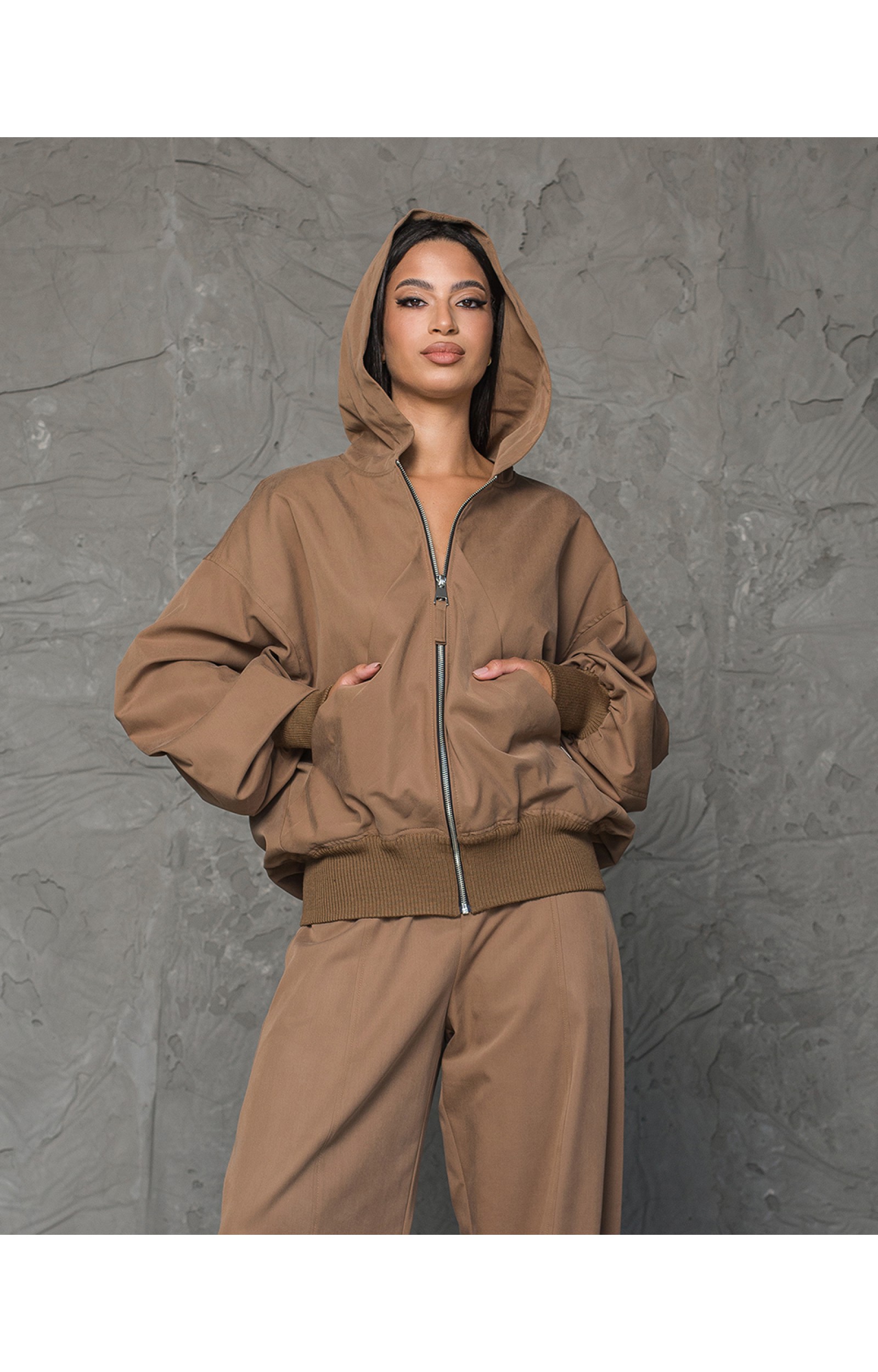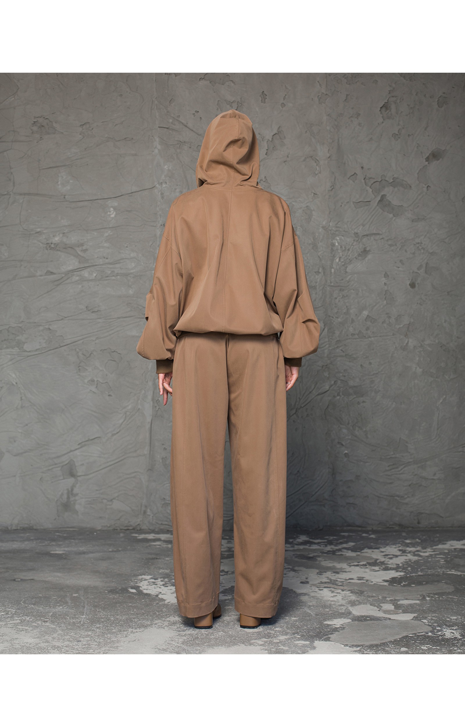 • Jacke: Lockerer Schnitt mit überschnittenen Schultern und einer voluminösen Kapuze. Ausgestattet mit hohen Strickbündchen und einem asymmetrischen Saum (vorne kurz, hinten länger).