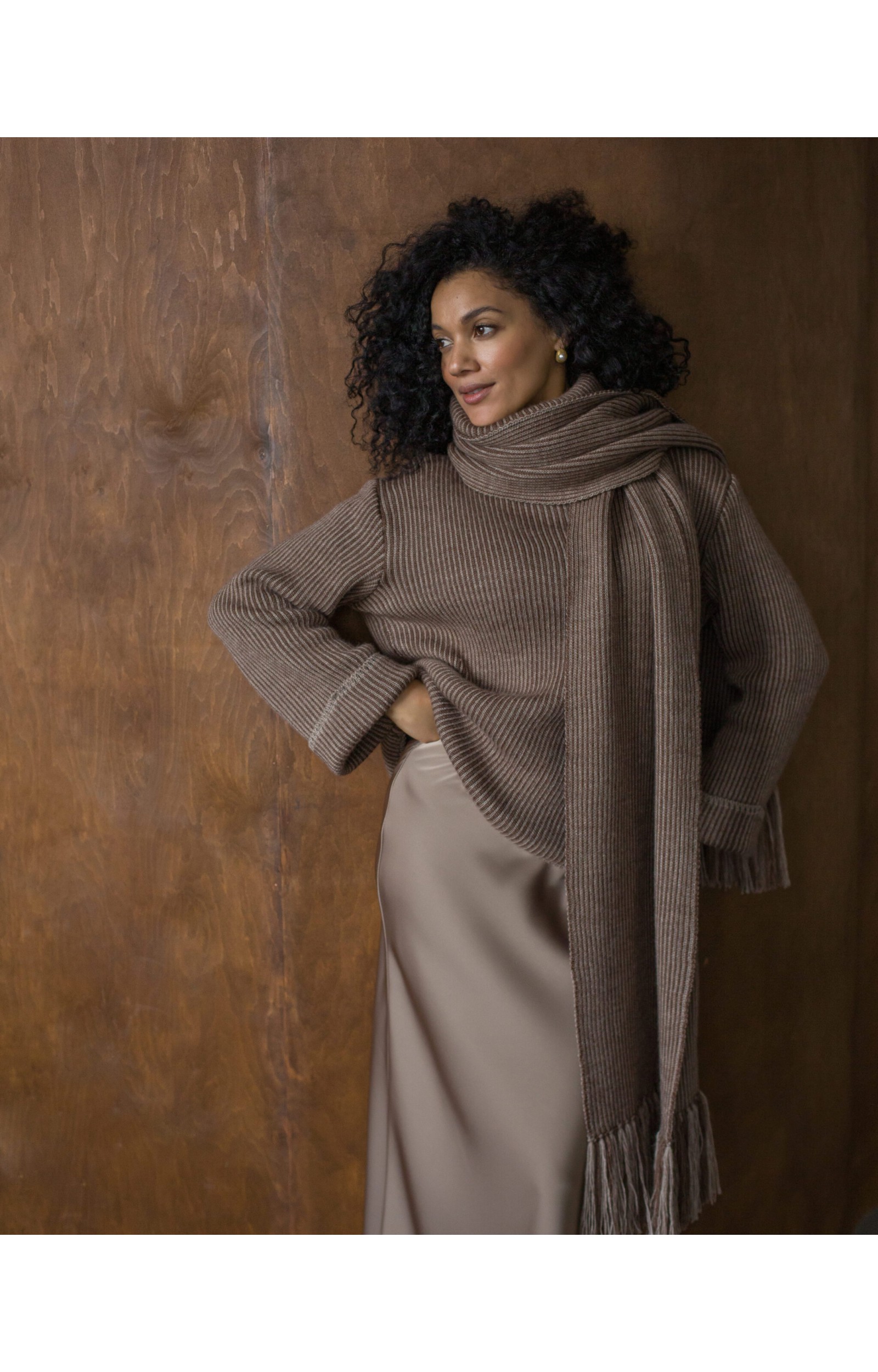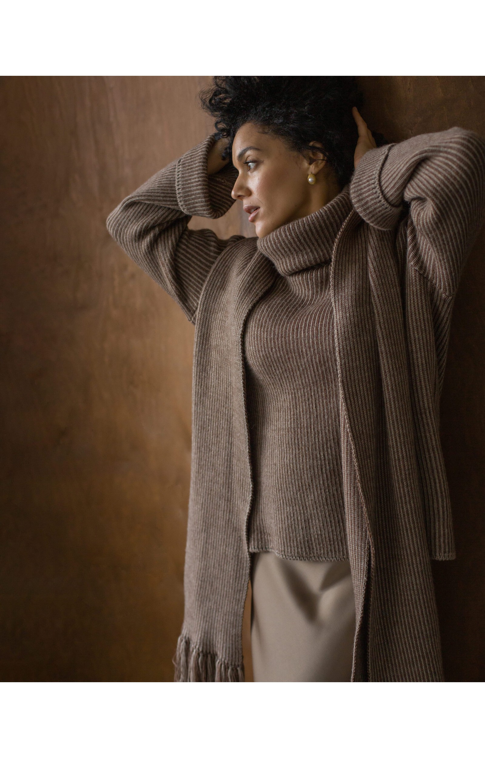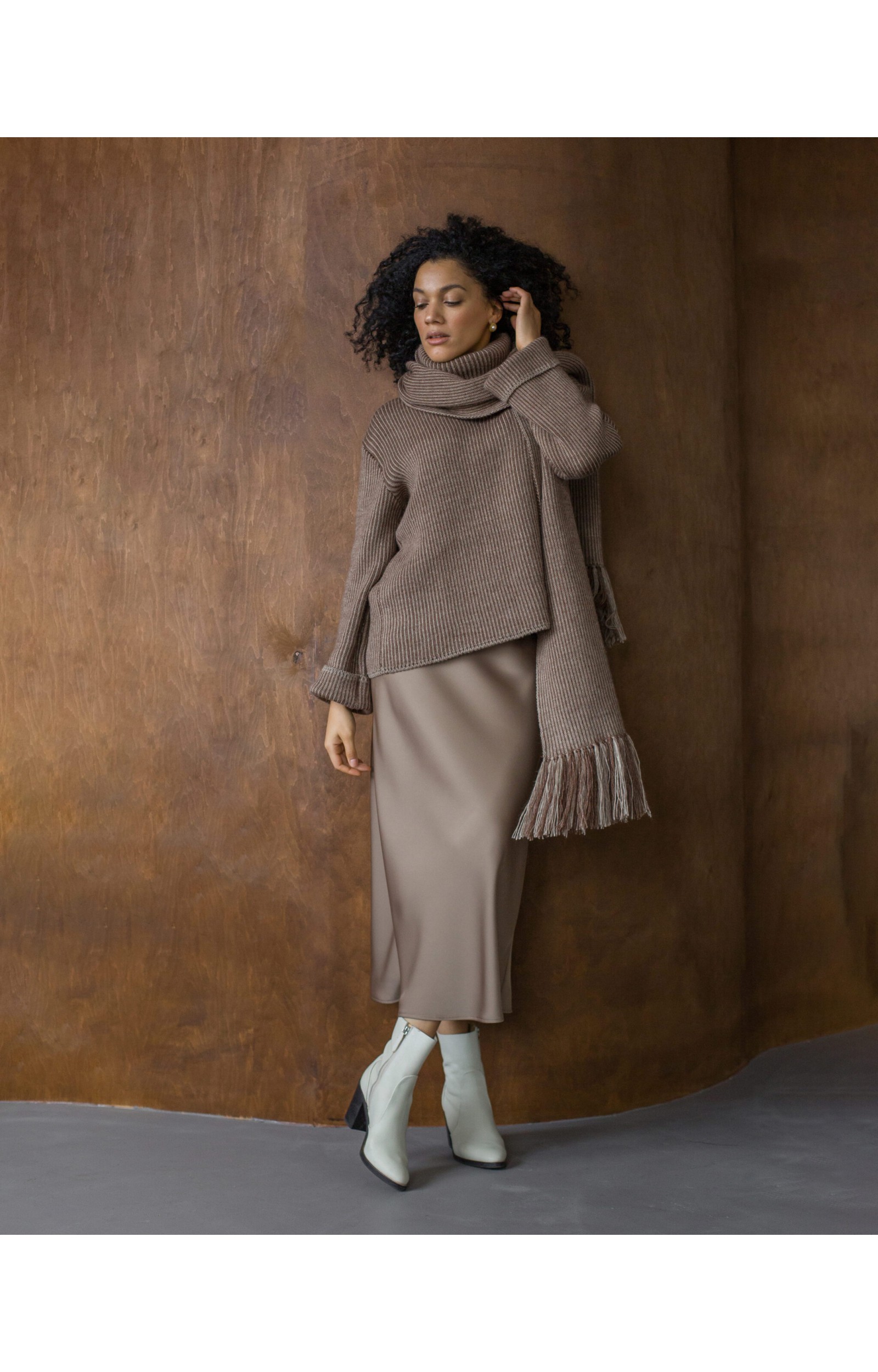 Das Modell in der Zweifarben-Kombination Taupe + Hellbeige zeichnet sich durch eine gemütliche, lockere Silhouette aus. Zu den Designmerkmalen gehören überschnittene Schultern, gerade, weite Ärmel mit Umschlag und ein hoher Stehkragen mit Umschlag. Der Pullover ist vielseitig: Er lässt sich gut sowohl zu Röcken als auch zu Hosen kombinieren.
