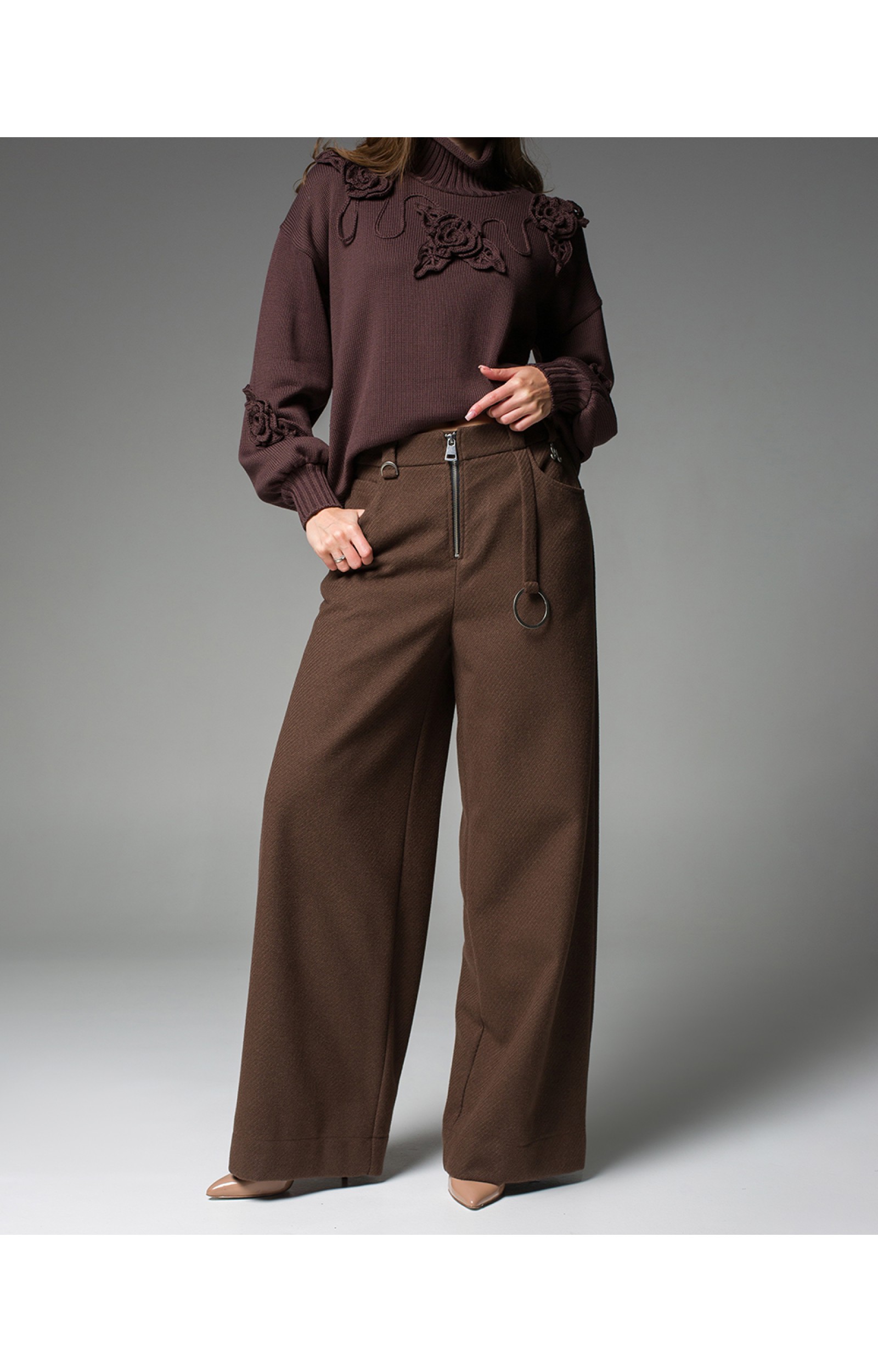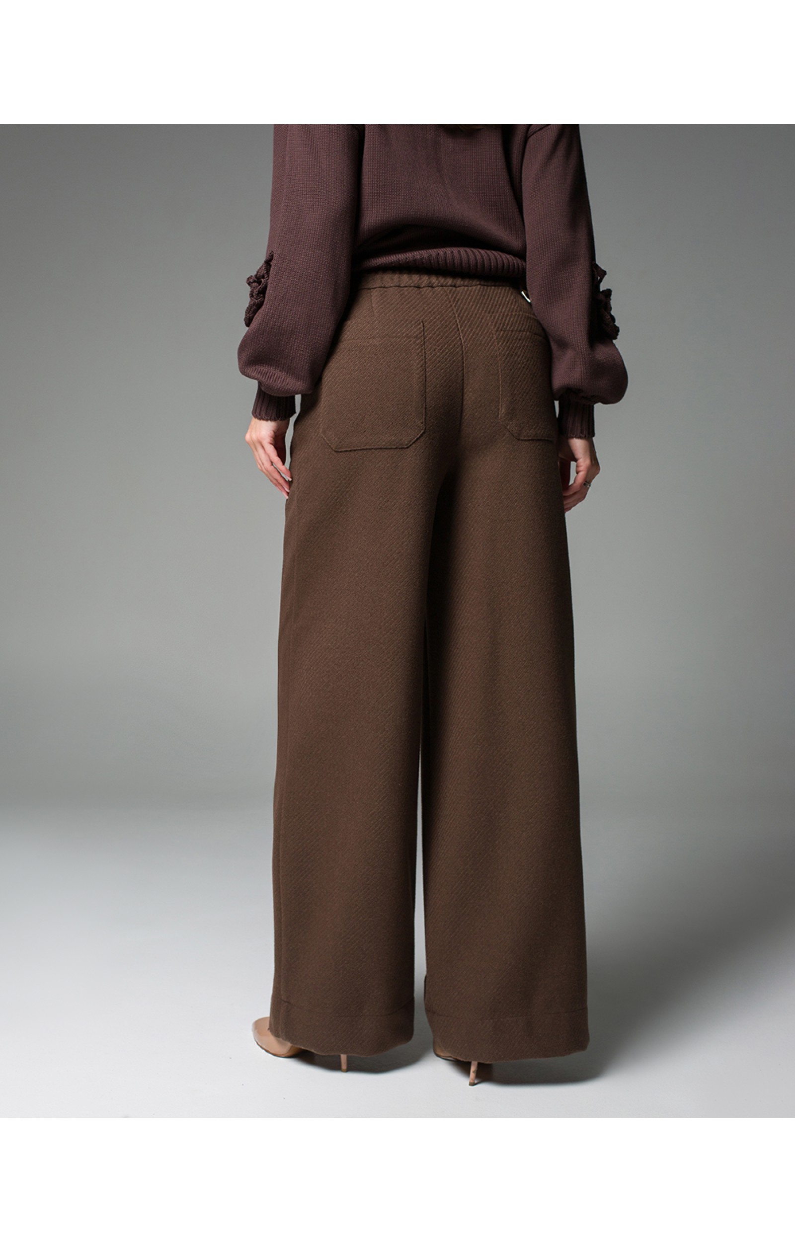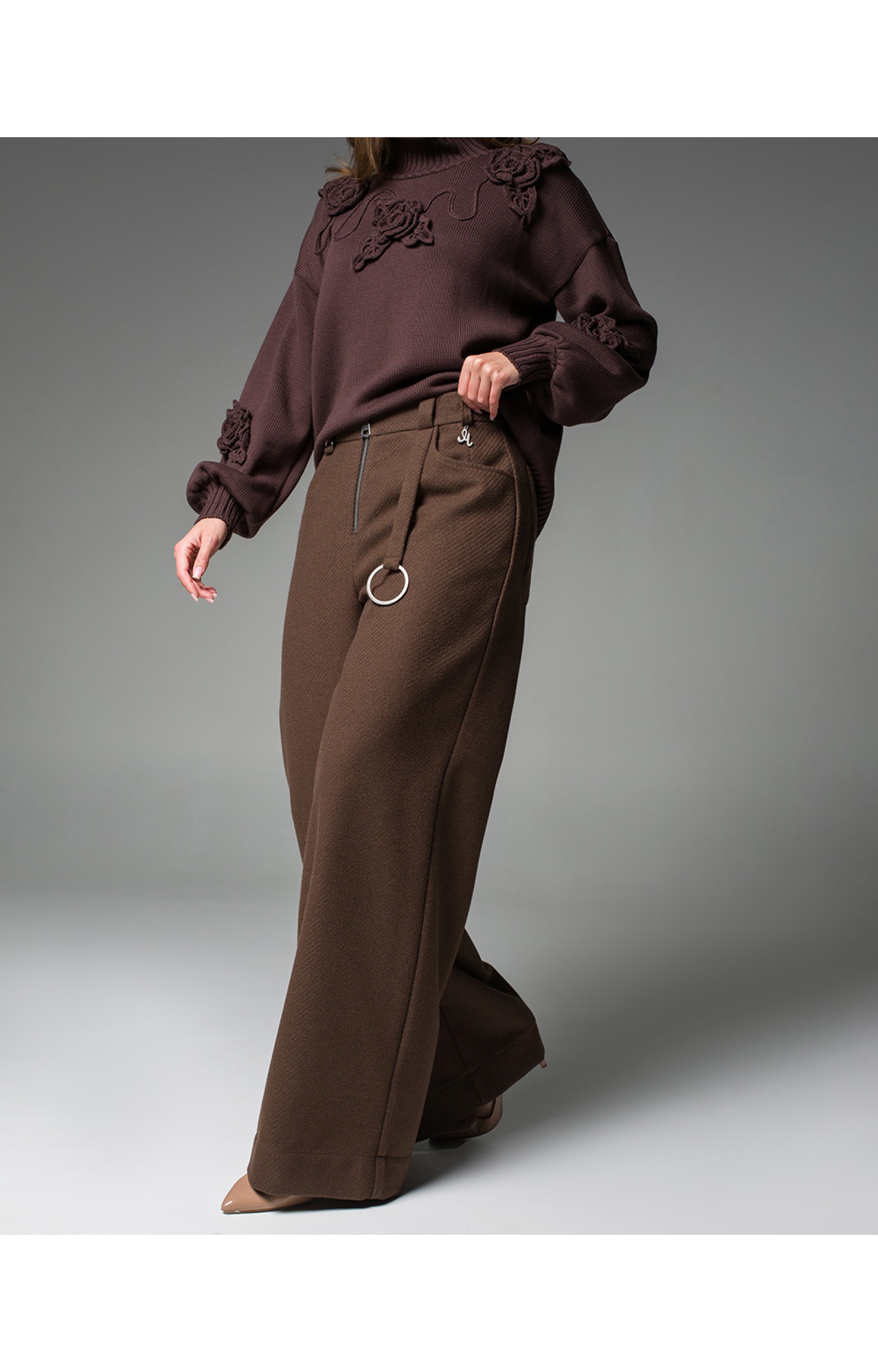 Diese Hose im tiefen Cappuccino-Ton ist eine meisterhafte Kombination aus skulpturalem Schnitt und modernem Komfort.