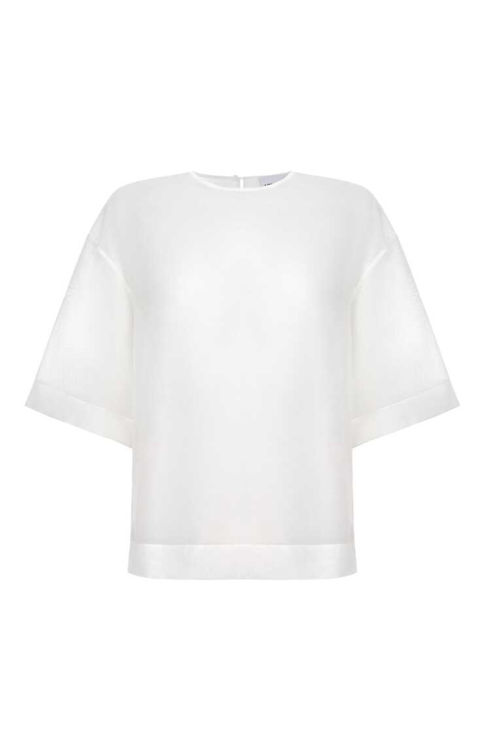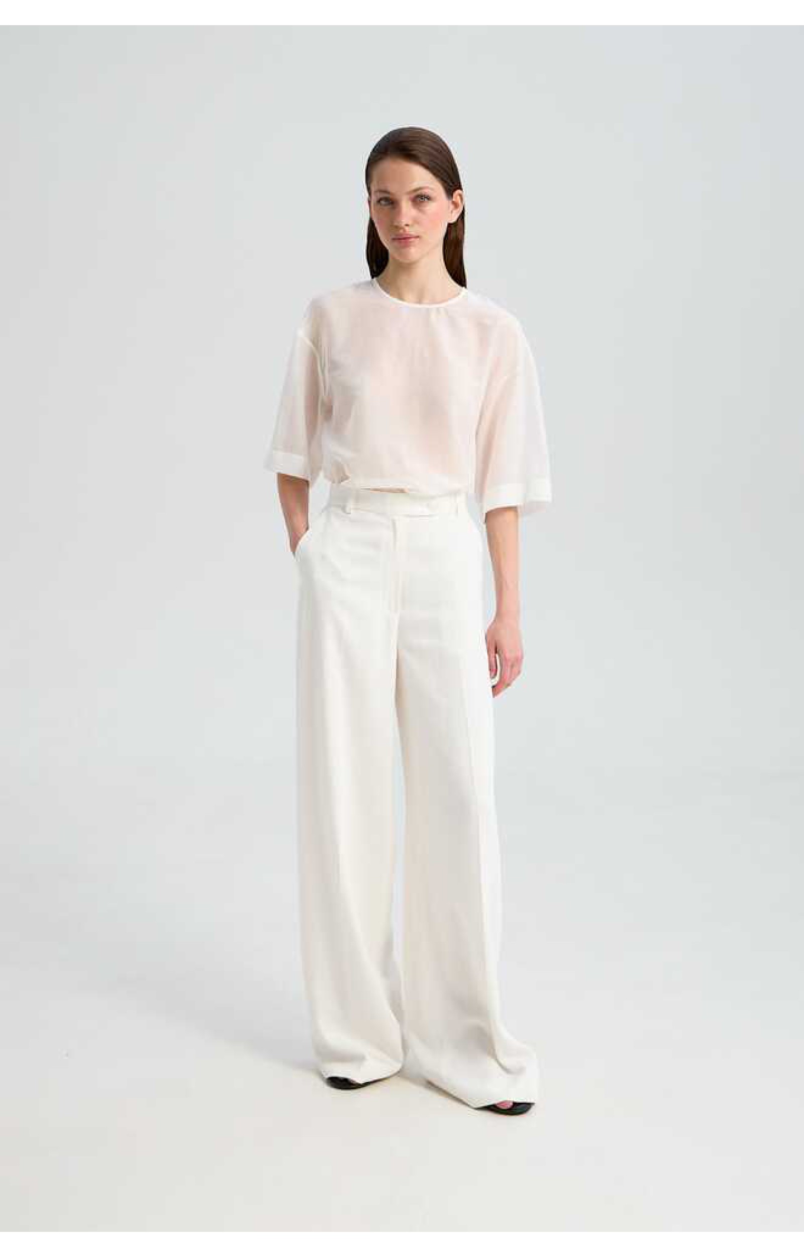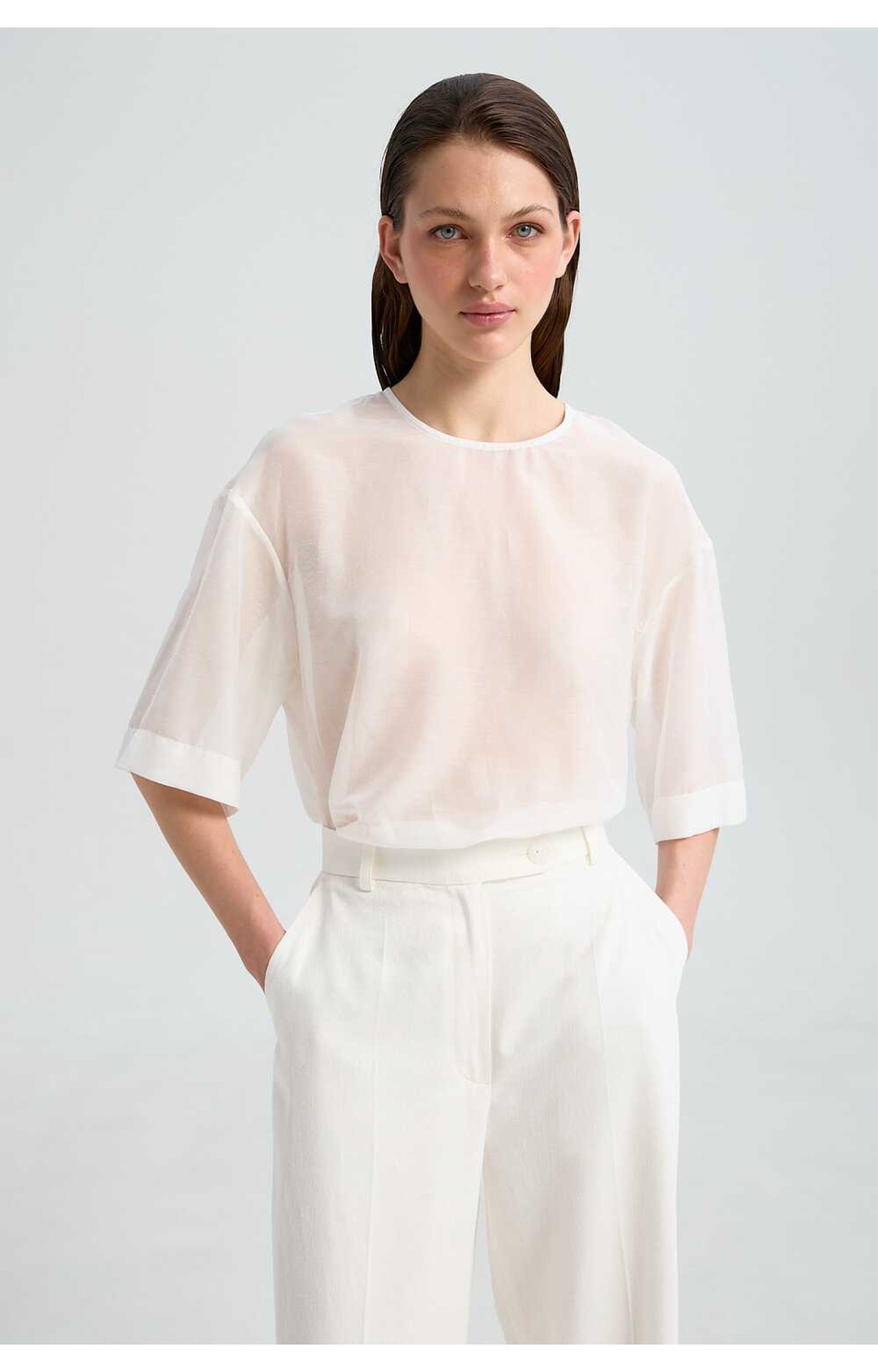 Dieses Top Manciet Weiß ist der Inbegriff von Minimalismus und Komfort. Hergestellt aus einer leichten und angenehm zu tragenden Mischung aus 30 % Seide und 70 % Baumwolle, ist es ideal für den täglichen Gebrauch. Das Modell mit lockerem, geradem Schnitt, kurzen Ärmeln und einem Rundhalsausschnitt bietet maximalen Komfort. Das Top wird hinten mit einem Knopf geschlossen, was seinem Design Eleganz und Schlichtheit verleiht.
