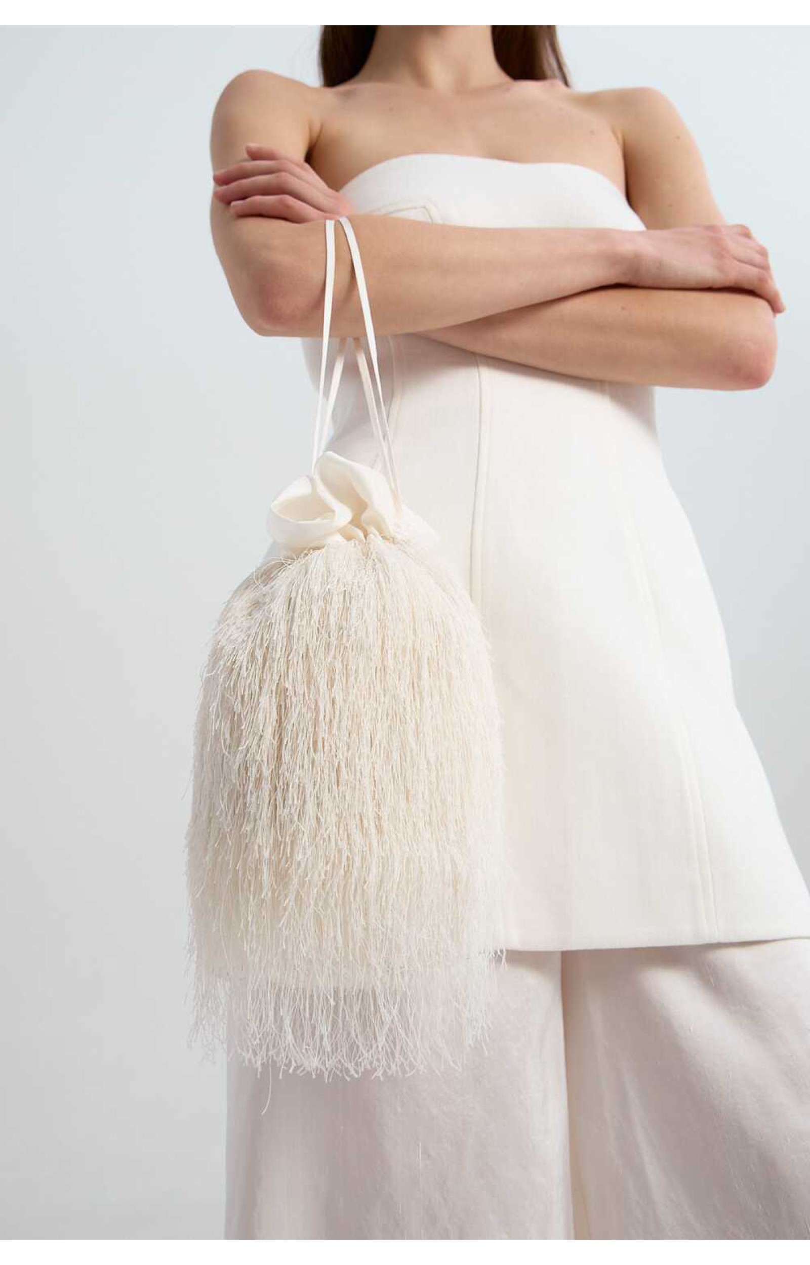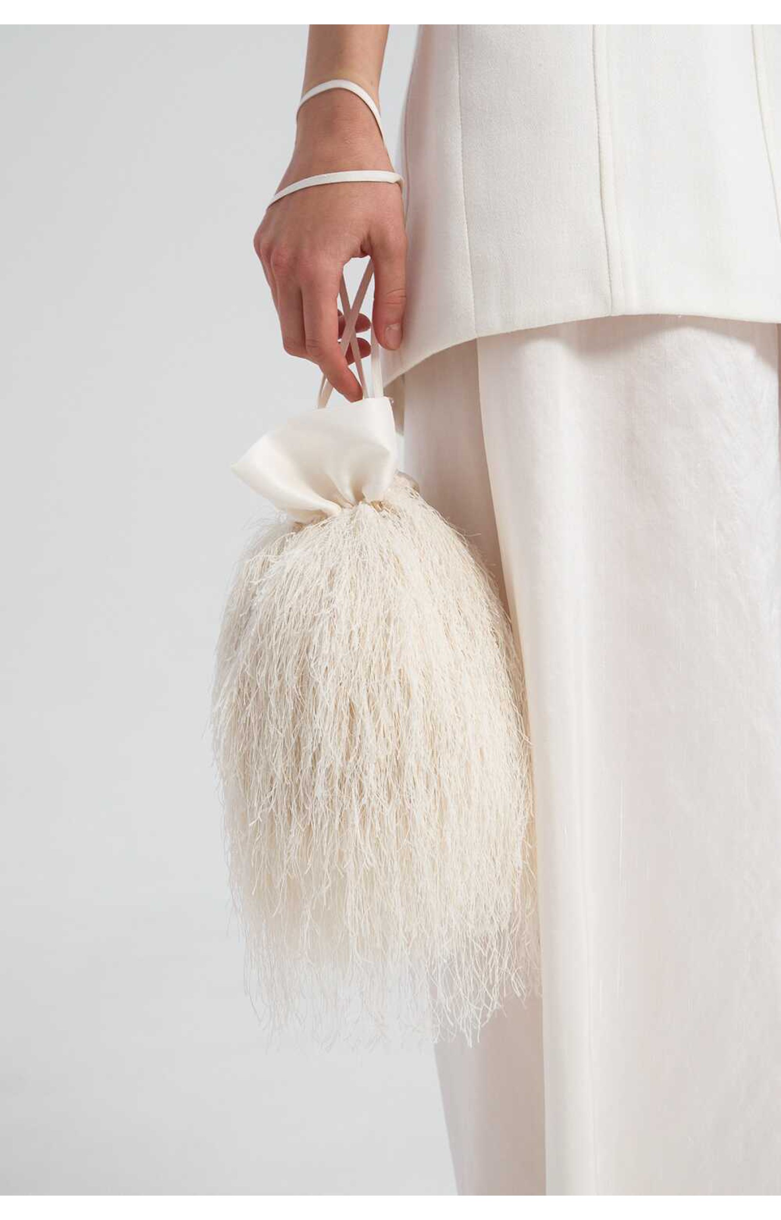 Die mini Fluffelle-Tasche in Milchweiß von L'eskizzo ist ein gewagtes und luxuriöses Accessoire, das zweifellos alle Blicke auf sich zieht. Dank ihrer kompakten Größe ist diese Tasche ideal für Abendveranstaltungen oder besondere Anlässe, wenn Sie nur das Nötigste zur Hand haben müssen. Ihre einzigartige Textur verleiht jedem Outfit Originalität und Raffinesse.