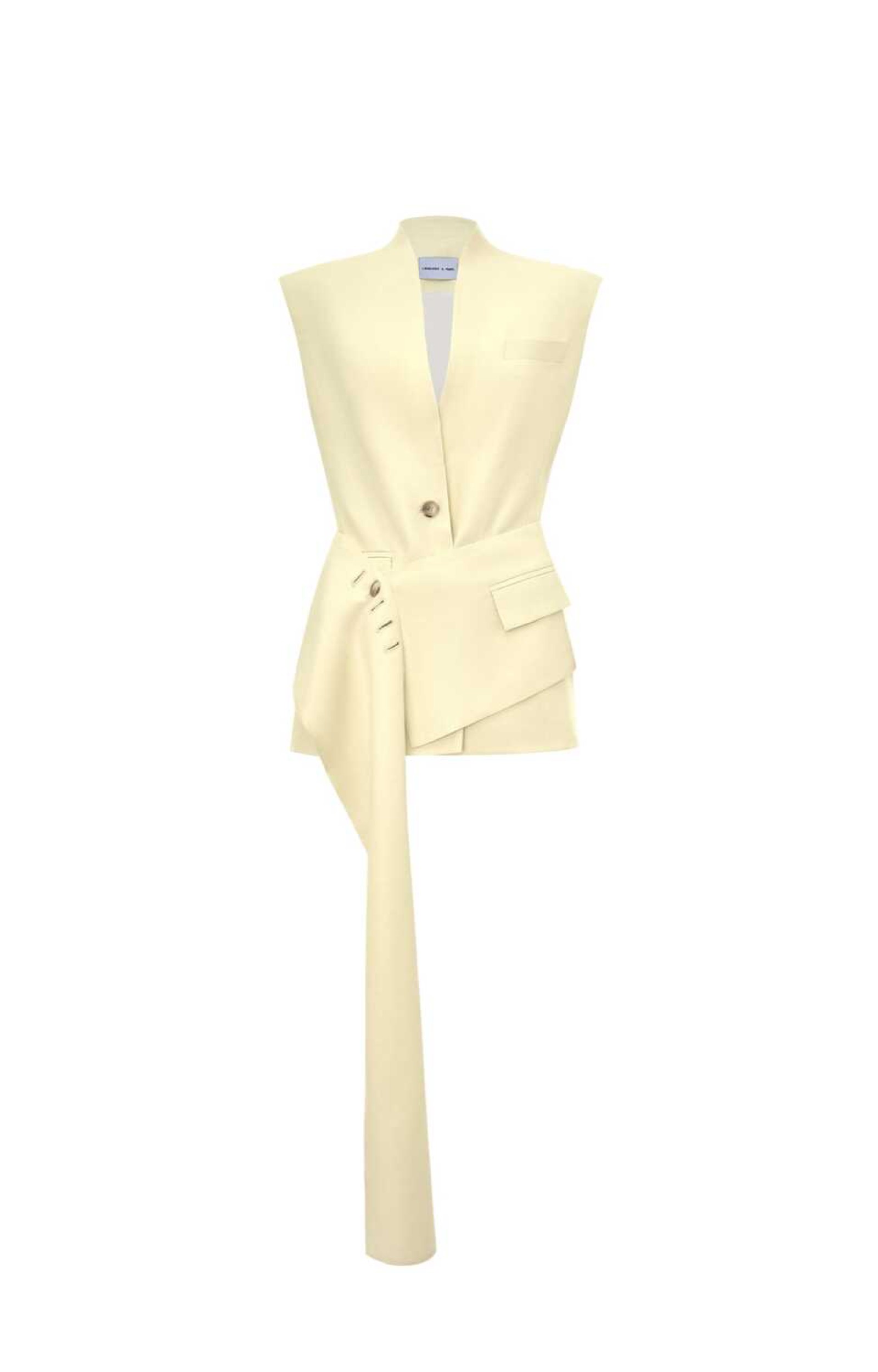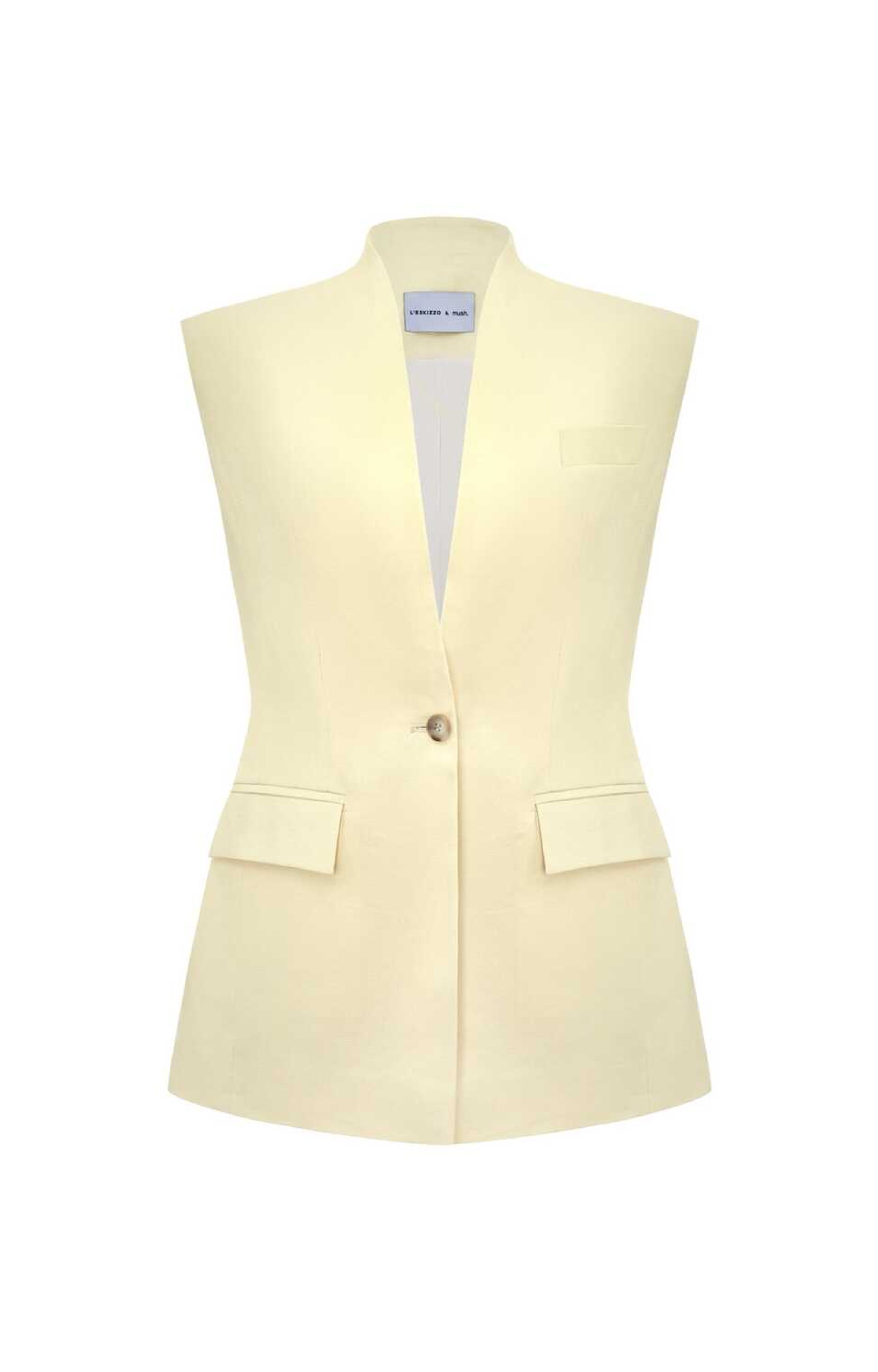 Die Weste Lil Buttercream von L'eskizzo ist eine elegante und funktionale Ergänzung für Ihre Garderobe. Dieses klassische, taillierte Modell in der zarten Farbe "Buttercreme" hat einen V-Ausschnitt und eine klar definierte Taille, die die weibliche Silhouette betont. Die Weste wird mit einem abnehmbaren Schößchen am Gürtel geliefert, das es Ihnen ermöglicht, den Look zu variieren und es mit anderen Kleidungsstücken zu kombinieren. Hergestellt aus 100 % Leinen mit einem Futter aus 100 % Viskose, bietet die Weste Komfort und ein angenehmes Tragegefühl.