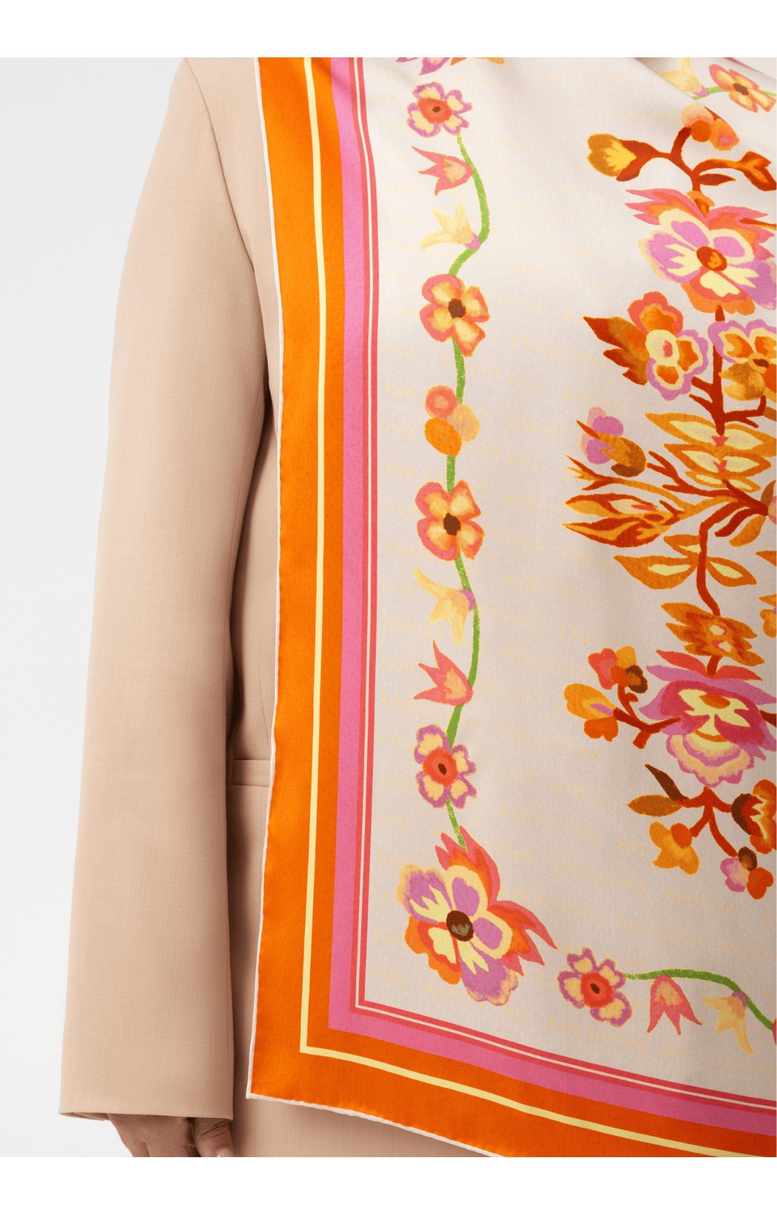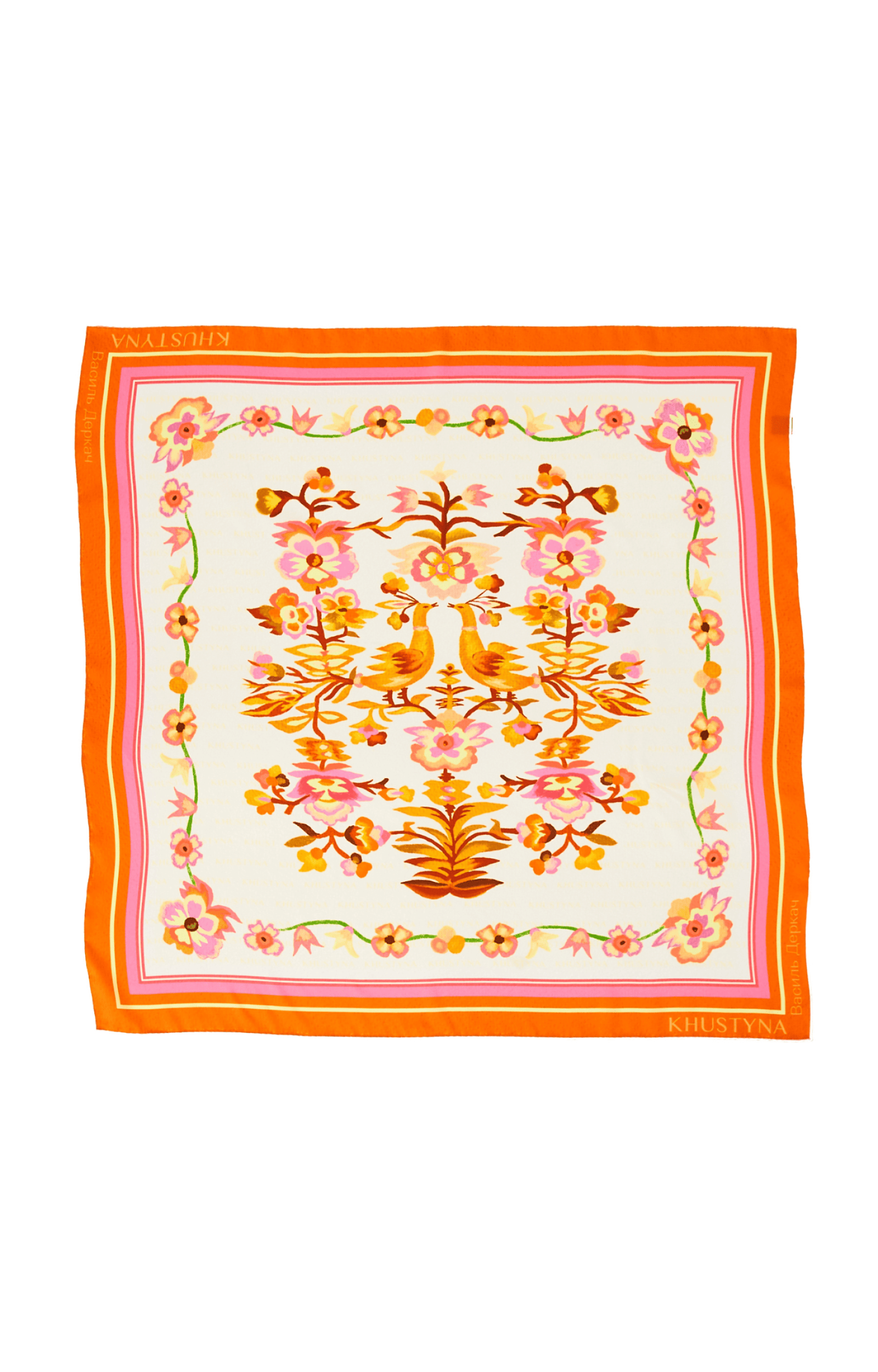 Dieses einzigartige Seidentuch aus der KYLYM-Kollektion der ukrainischen Marke Khustyna wurde vom Teppich „Vesilnyi“ (Hochzeitsteppich) von Wassyl Derkatsch inspiriert. Jedes Stück ist aus hochwertiger Seide gefertigt, und die Kanten sind von Hand genäht, was die außergewöhnliche Qualität unterstreicht. Das Tuch hat eine würzige, pfirsichfarbene Tönung.