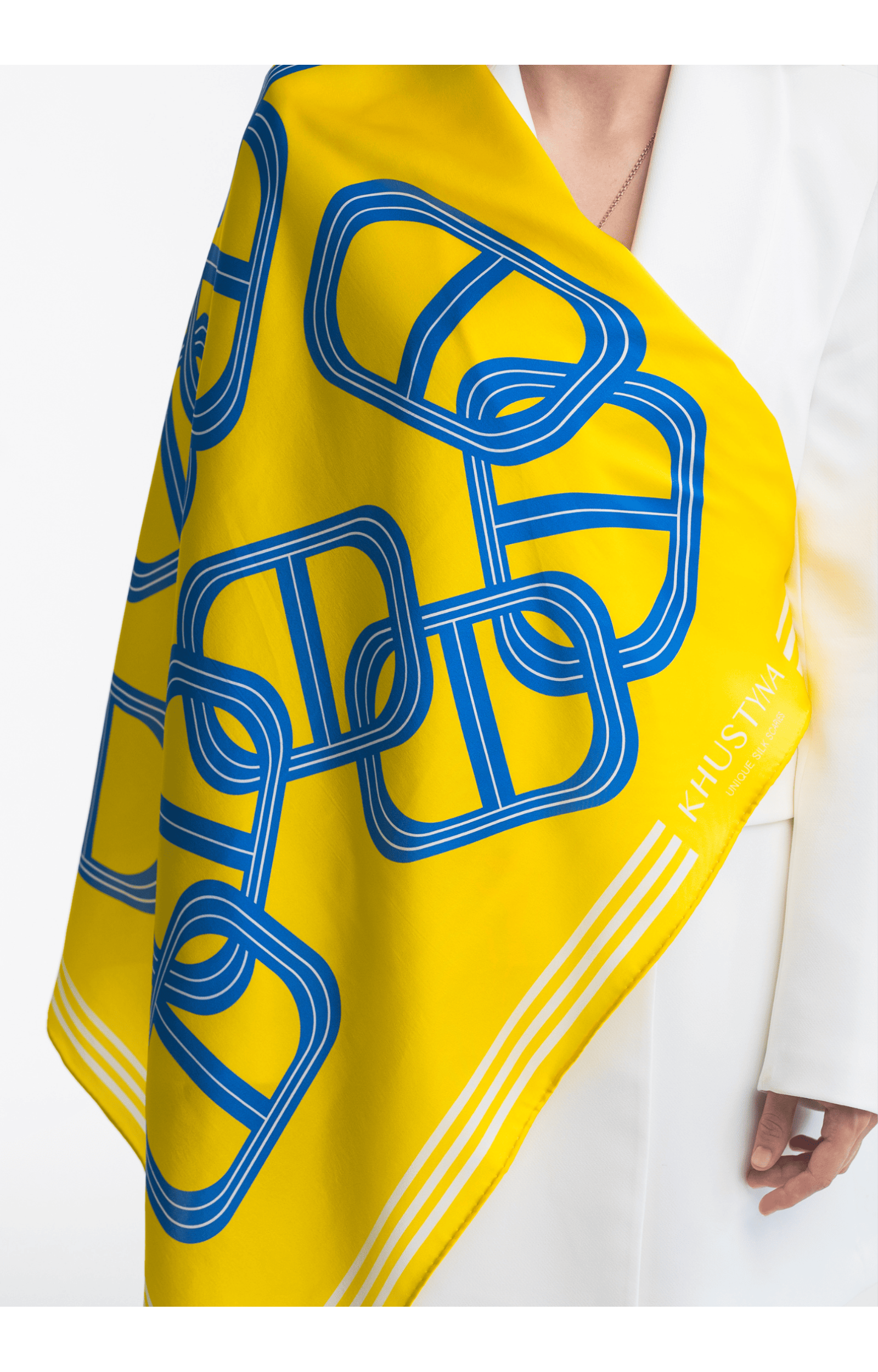 Dieses einzigartige Seidentuch der ukrainischen Marke Khustyna ist ein ausdrucksstarkes Accessoire mit einem abstrakten Druck im Jugendstil. Jedes Design ist ein Unikat und wurde von ukrainischen Illustratoren entworfen.