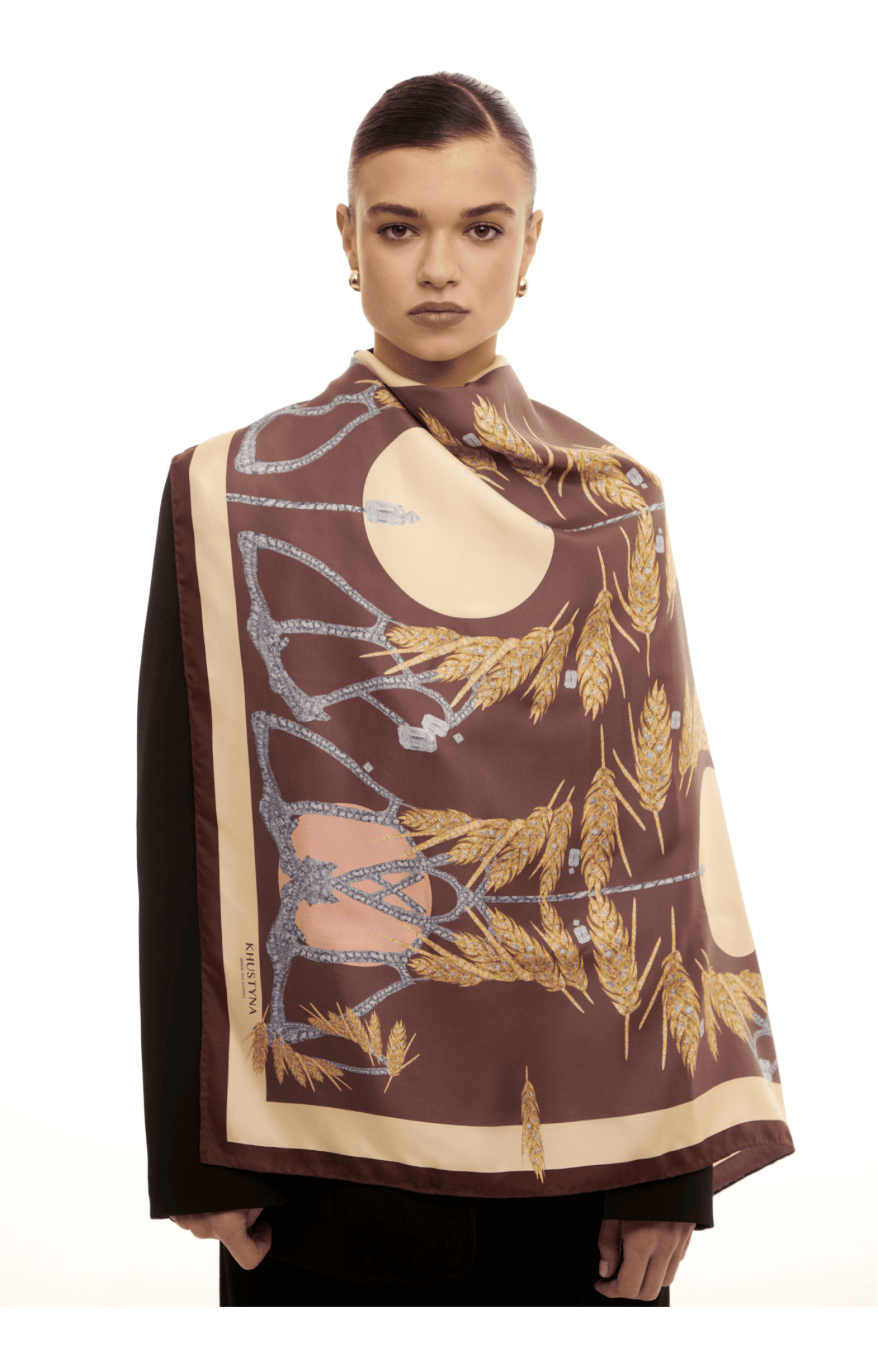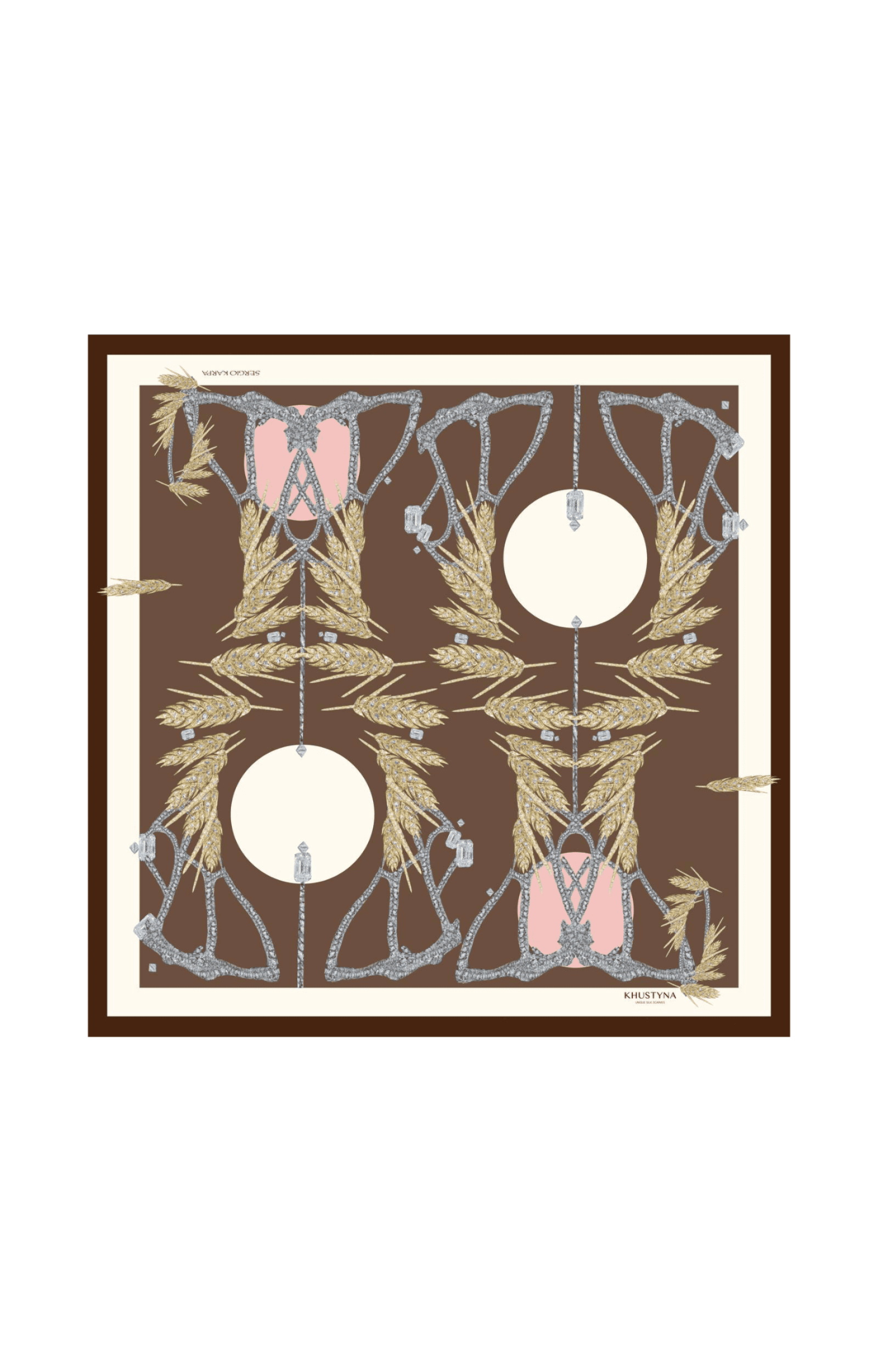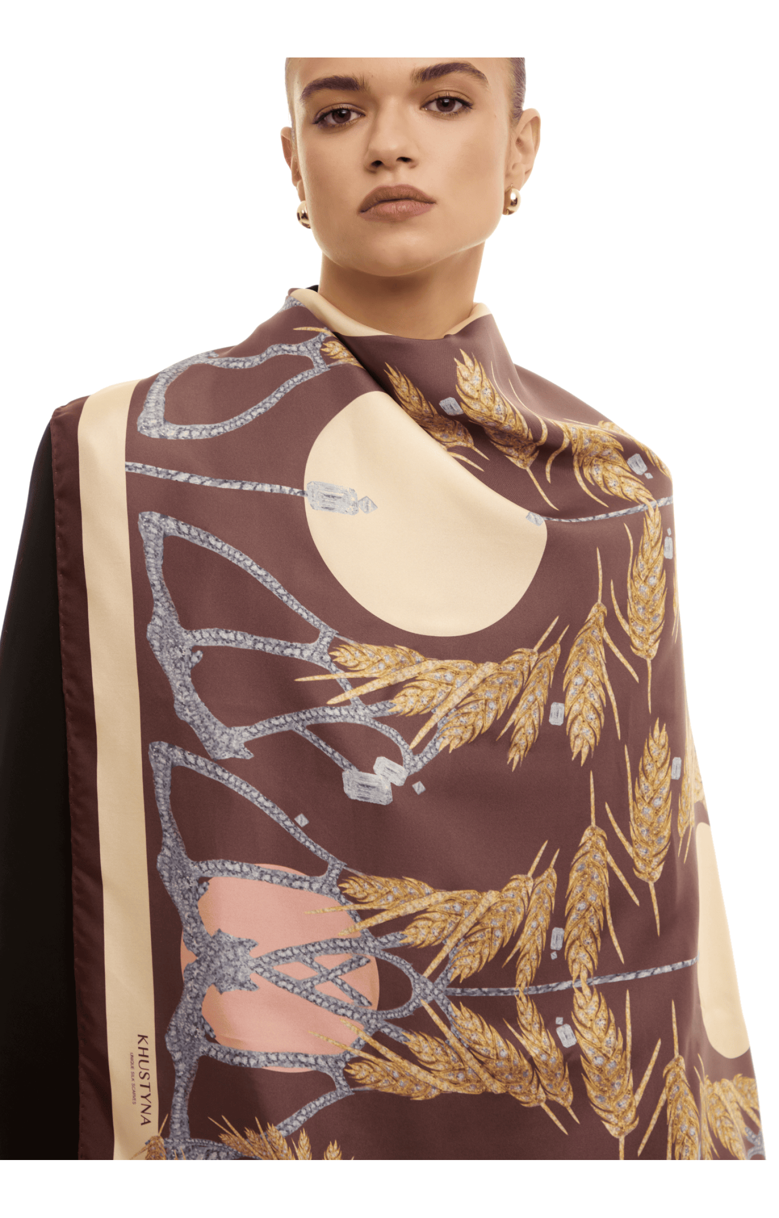 Dieses Seidentuch der ukrainischen Marke Khustyna ist ein exquisites und einzigartiges Accessoire in Schokoladentönen. Jedes Design ist ein Unikat und wurde von Illustratoren aus der ganzen Welt entworfen.