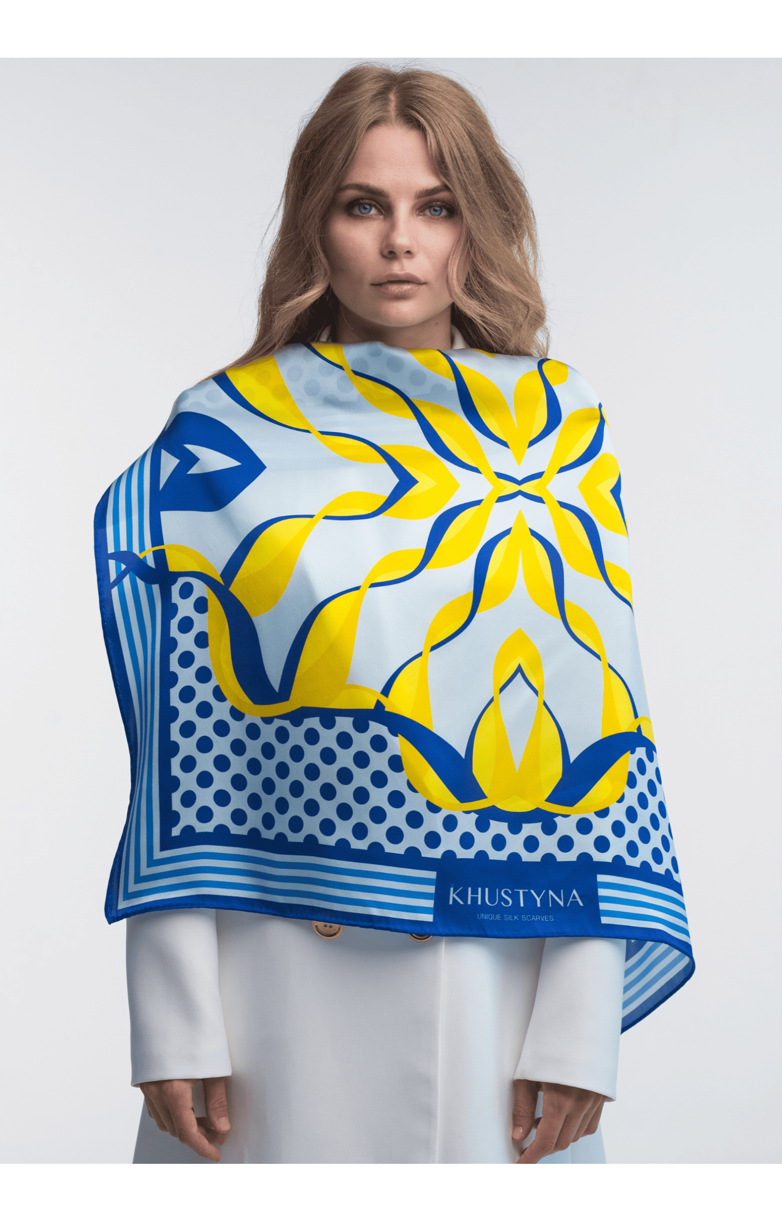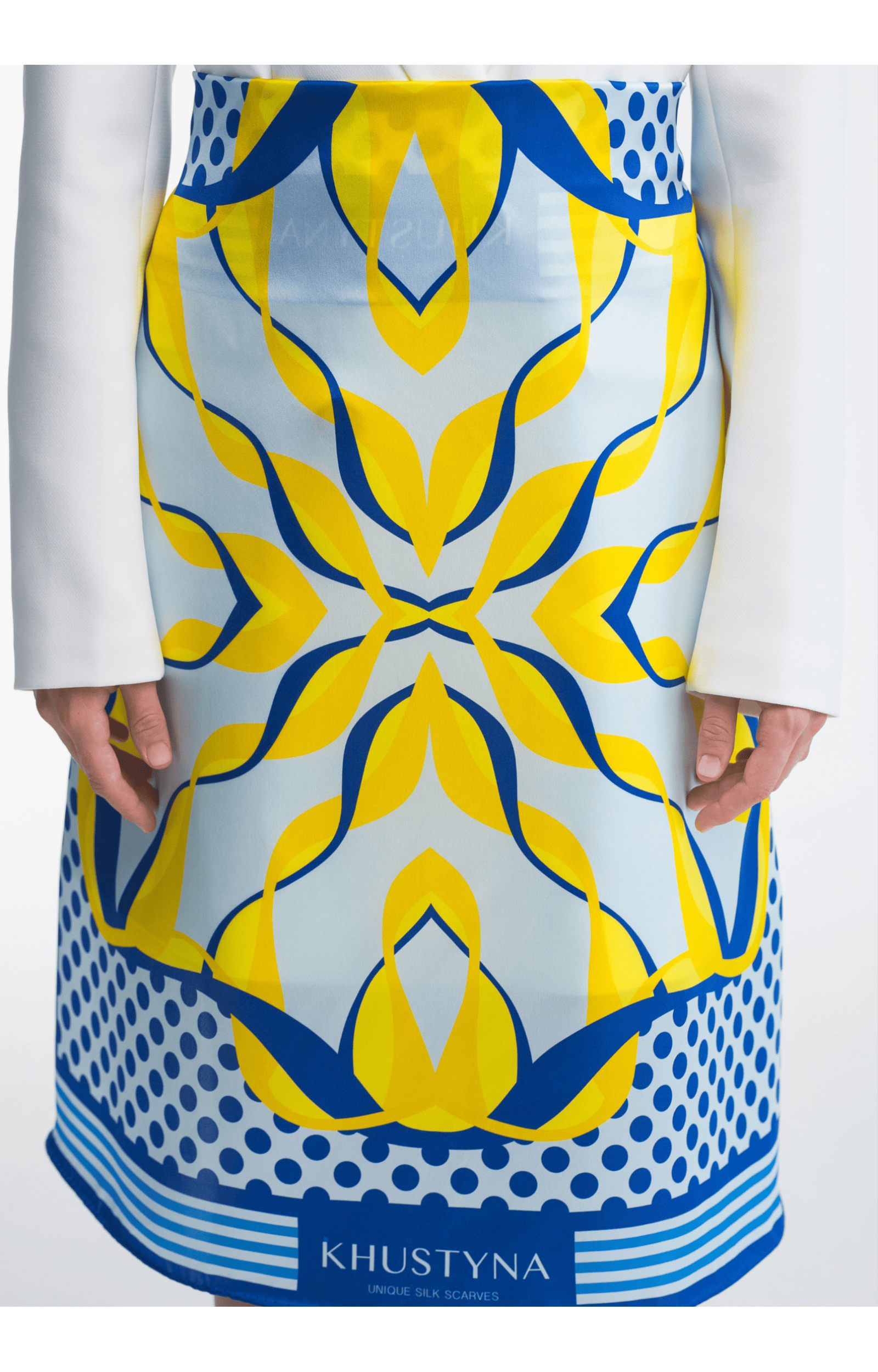 Dieses Seidentuch Ukrainische Hummel von Khustyna ist die perfekte Verkörperung ukrainischer Ästhetik und modernen Stils. Das Accessoire ist in einem tiefen, satten Blau gehalten, das im Muster dominiert und den unendlichen Himmel symbolisiert. Das Tuch besteht aus 100% Seide (Crêpe de Chine) für eine luxuriöse Textur, während der handgenähte Saum die Premium-Qualität unterstreicht.