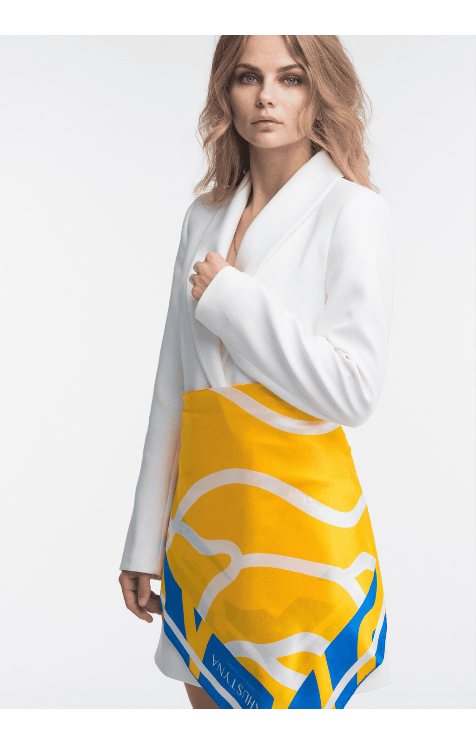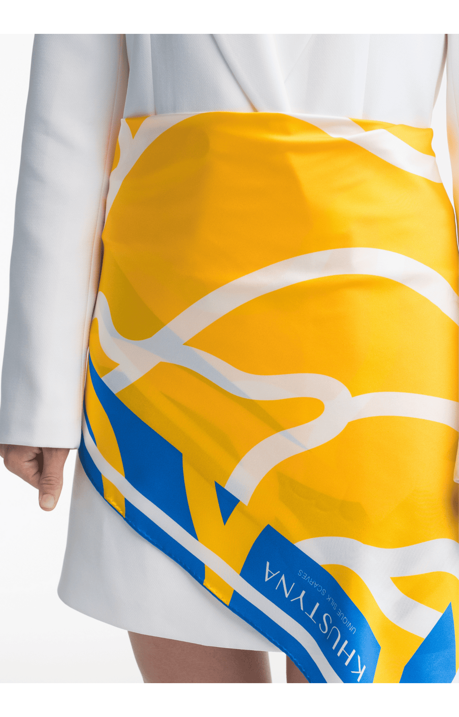 Das Design des Tuchs symbolisiert die elementare Schönheit des ukrainischen Himmels und greift das Thema "Donner und Blitz" auf. Das von Illustratoren aus der ganzen Welt entworfene Muster ist in einer kontrastreichen Gelb-Blau-Palette gehalten. Der zentrale Teil ist mit wellenförmigen gelben Formen gefüllt, die an die Energie eines Blitzes erinnern, und wird von tiefem Blau umrahmt. Weiße Linien trennen die Farbblöcke und sorgen für ein dynamisches Element.