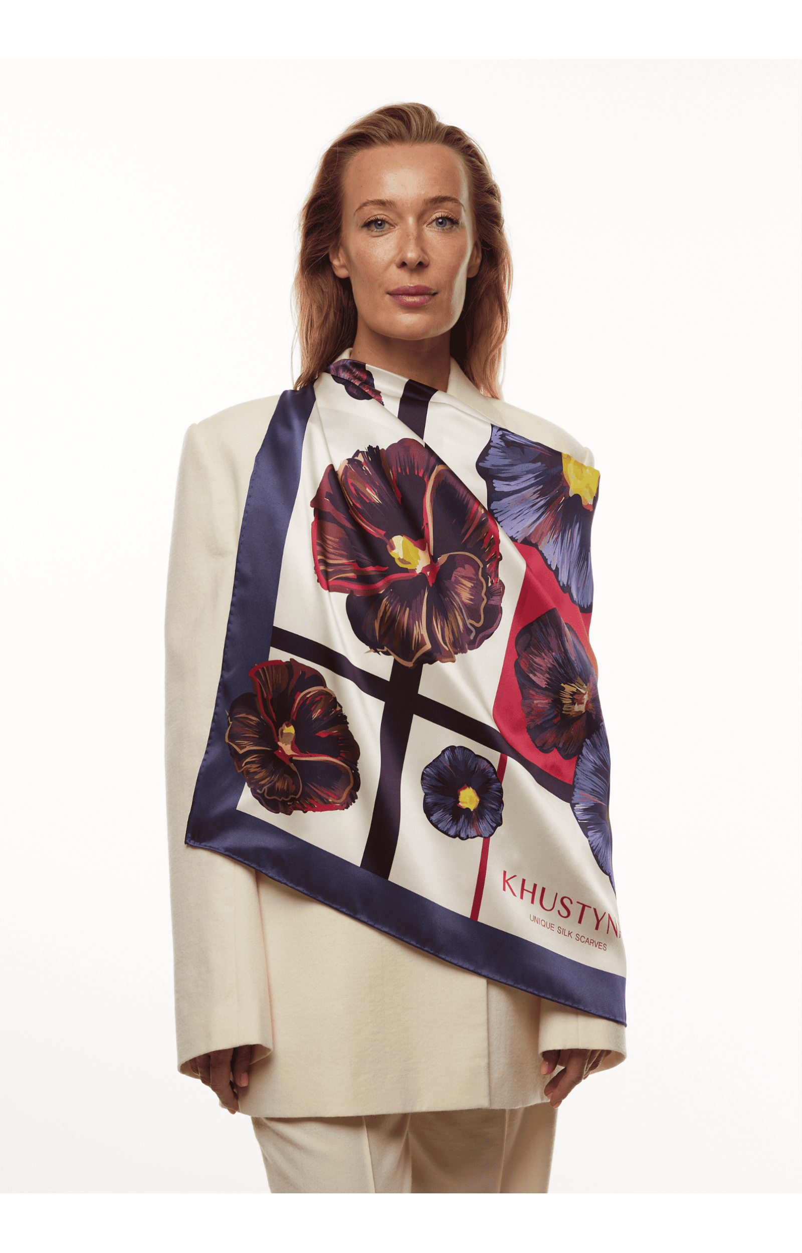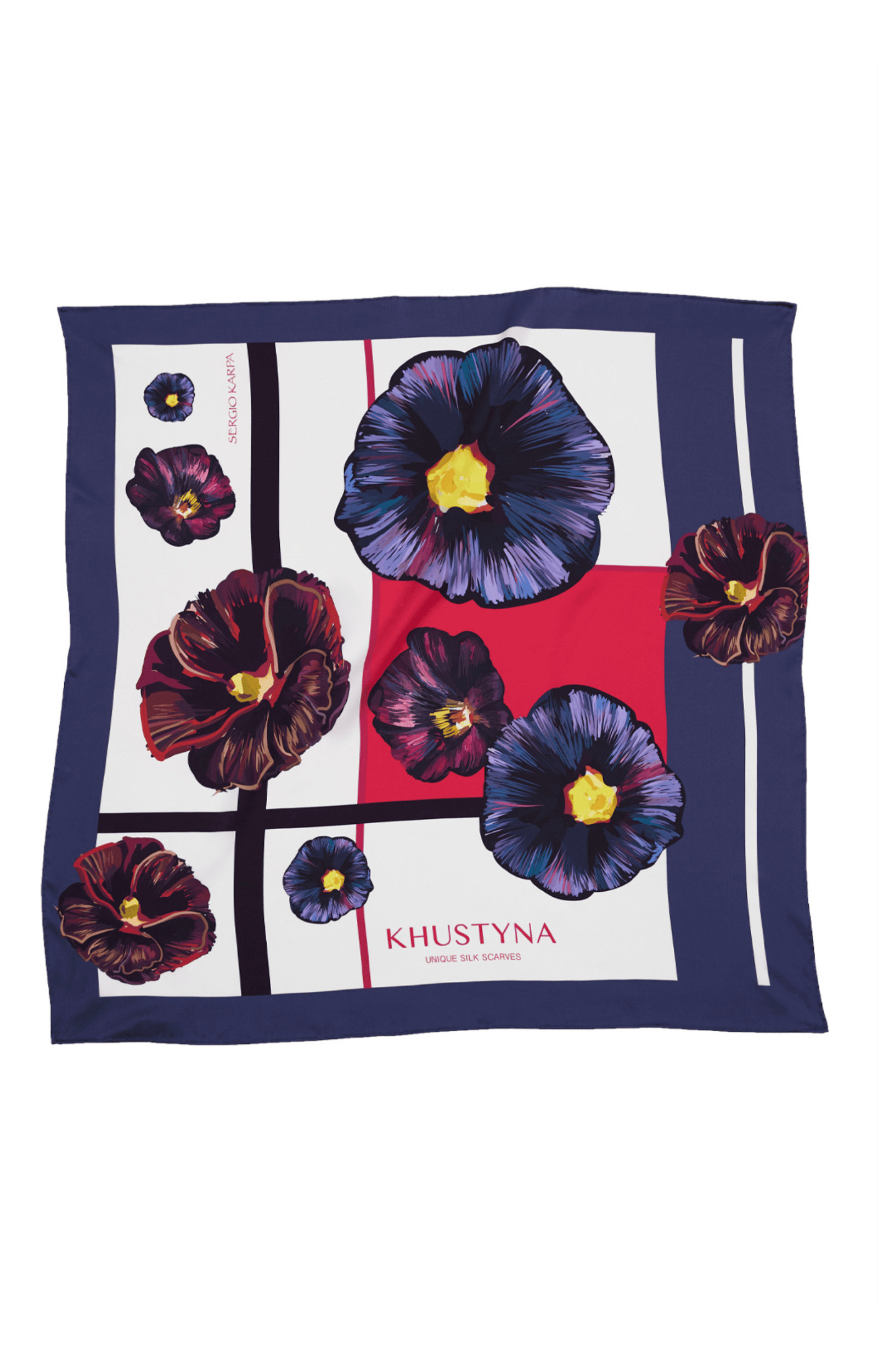 Dieses Seidentuch Ukrainische Blumen von Khustyna ist ein wahres Kunstwerk, das die Intensität der violetten Farbe mit grafischer Eleganz verbindet. Es besteht aus 100% Seide, und der handgenähte Saum garantiert seine Premium-Qualität.