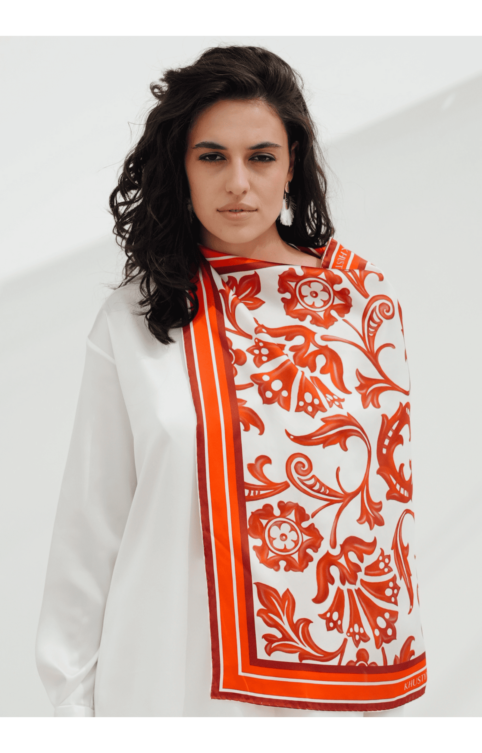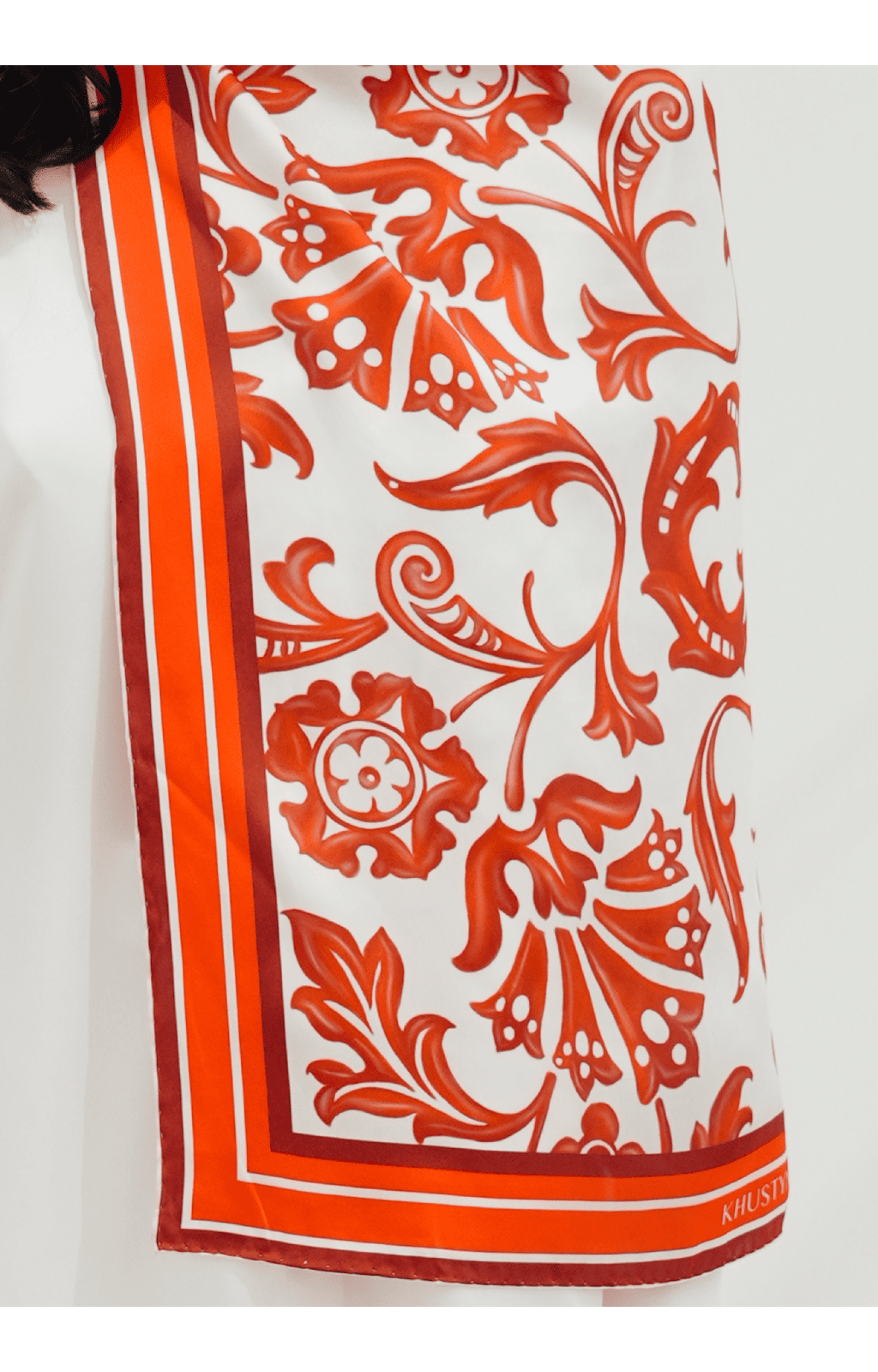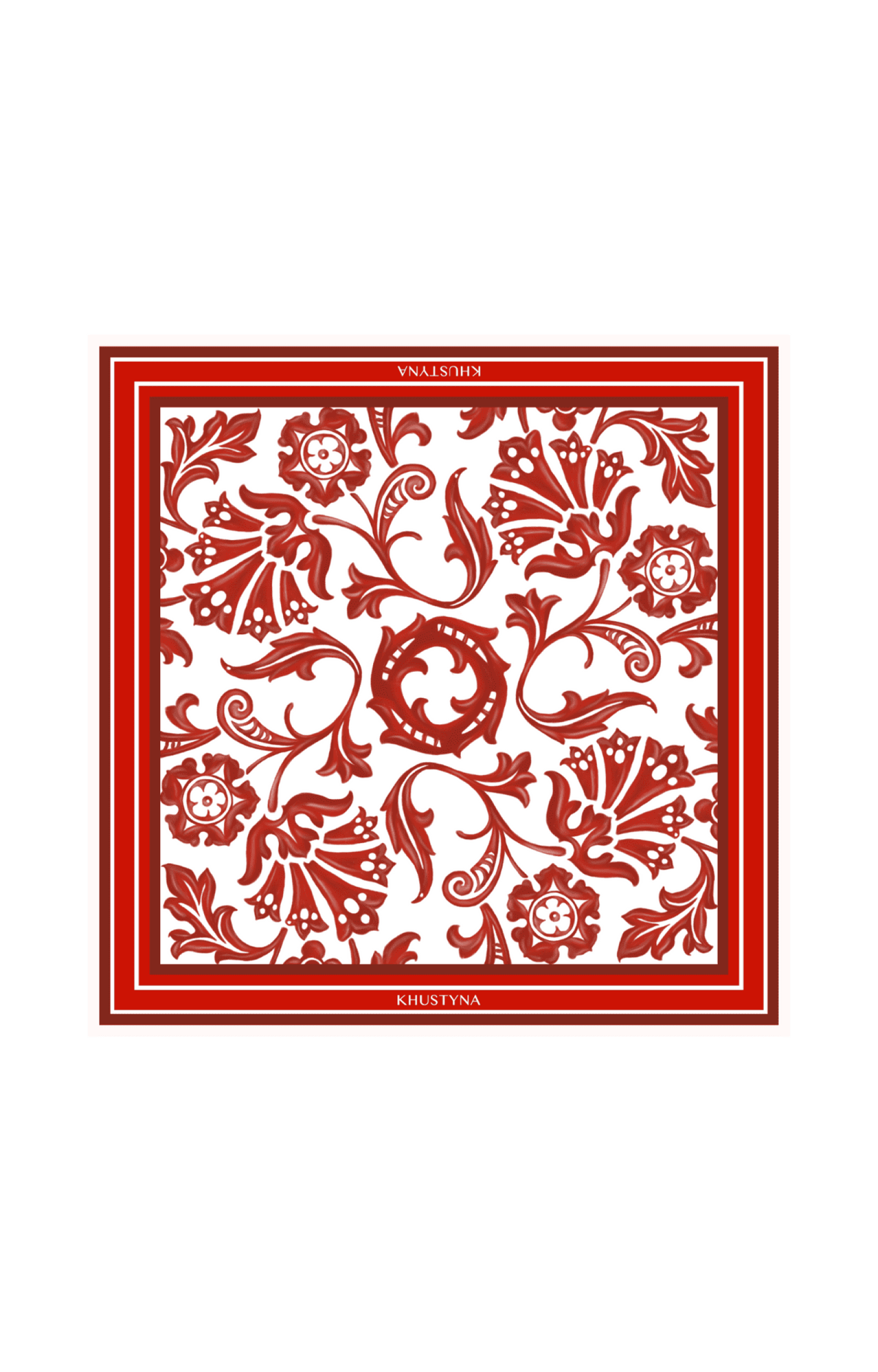 Dieses Tuch ist die Verkörperung klassischer Schönheit und traditioneller Muster. Das Seidentuch Maiolica von Khustyna, ausgeführt in tiefem Rot, ist eine Hommage an die eleganten Keramikornamente des Mittelmeerraumes.