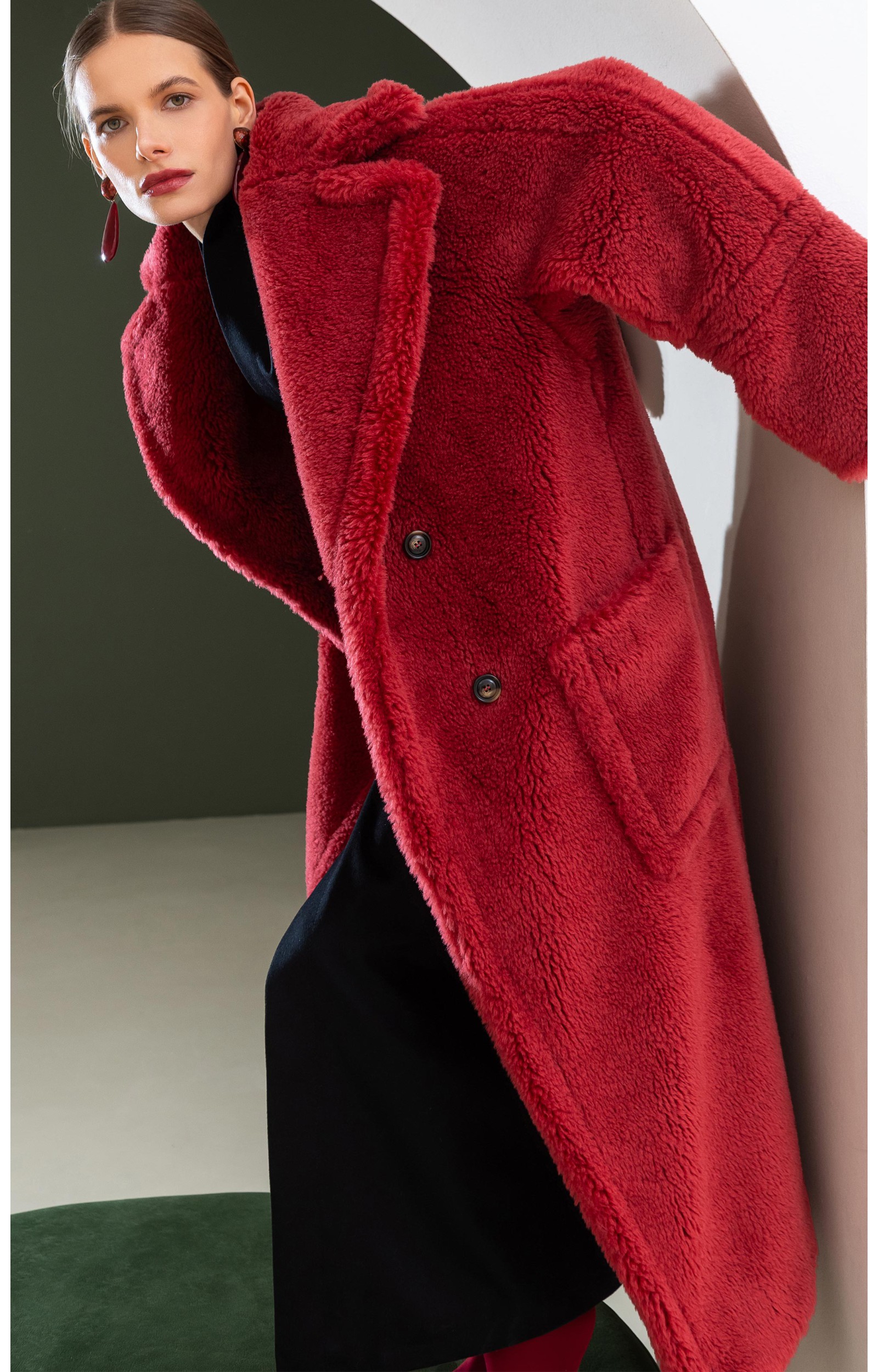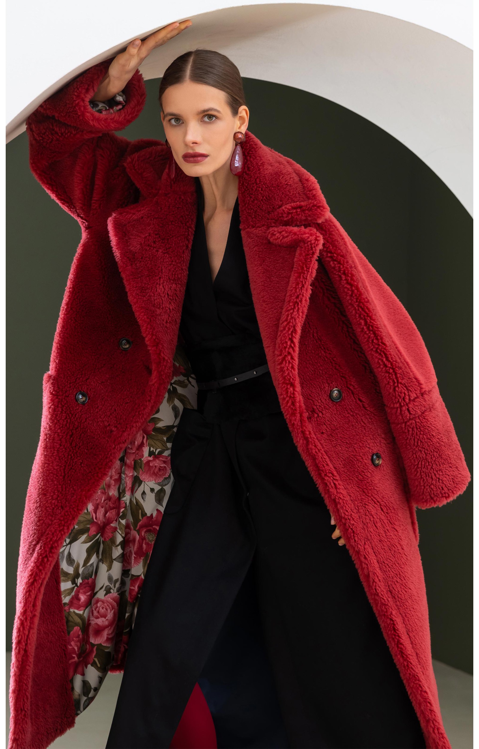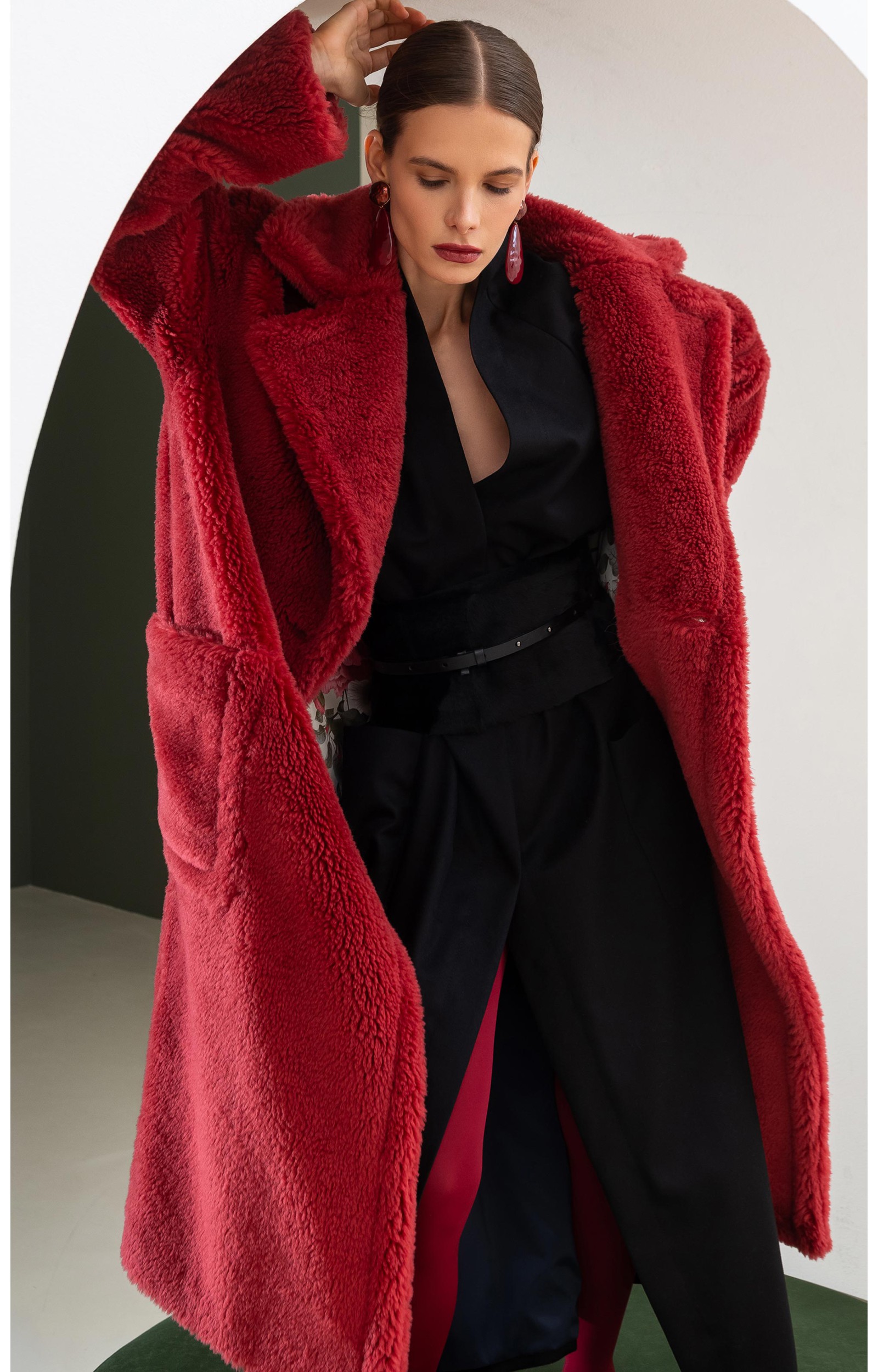The model is made from 100% camel wool, which gives it exceptional softness and warmth while mimicking natural fur. The deep and rich Lava Red color makes this coat a true statement piece for any outfit. The loose fit and soft texture ensure comfort and elegance.